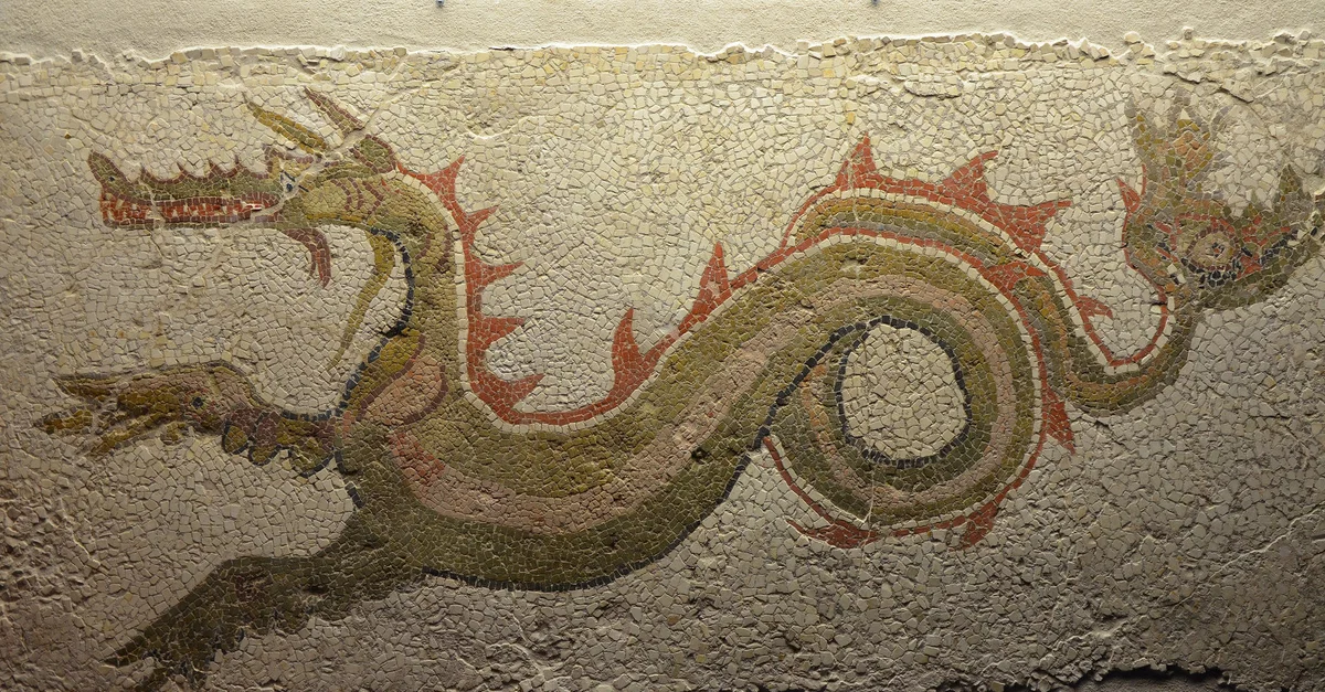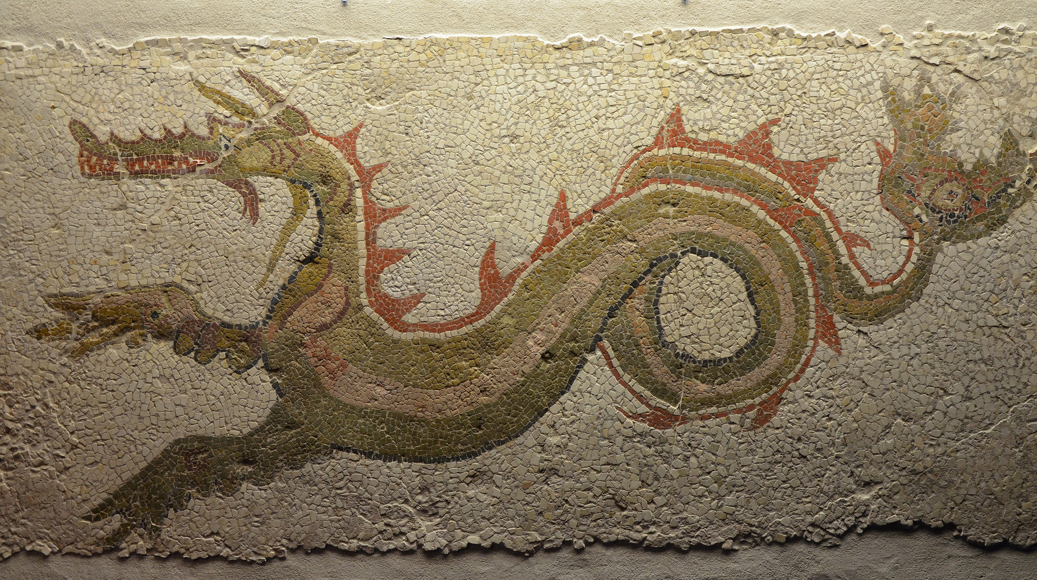 Mosaic with a ketos (sea monster - Latinized as cetus) found at Caulonia (Monasterace) in the Casa del Drago, 3rd century BCE.