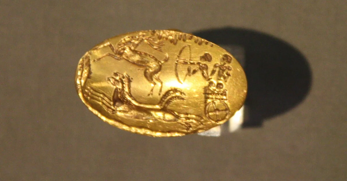 A Mycenaean gold ring depicting a hunting scene. From Grave Circle A, Mycenae, 16th century BCE. (National Archaeological Museum, Athens)