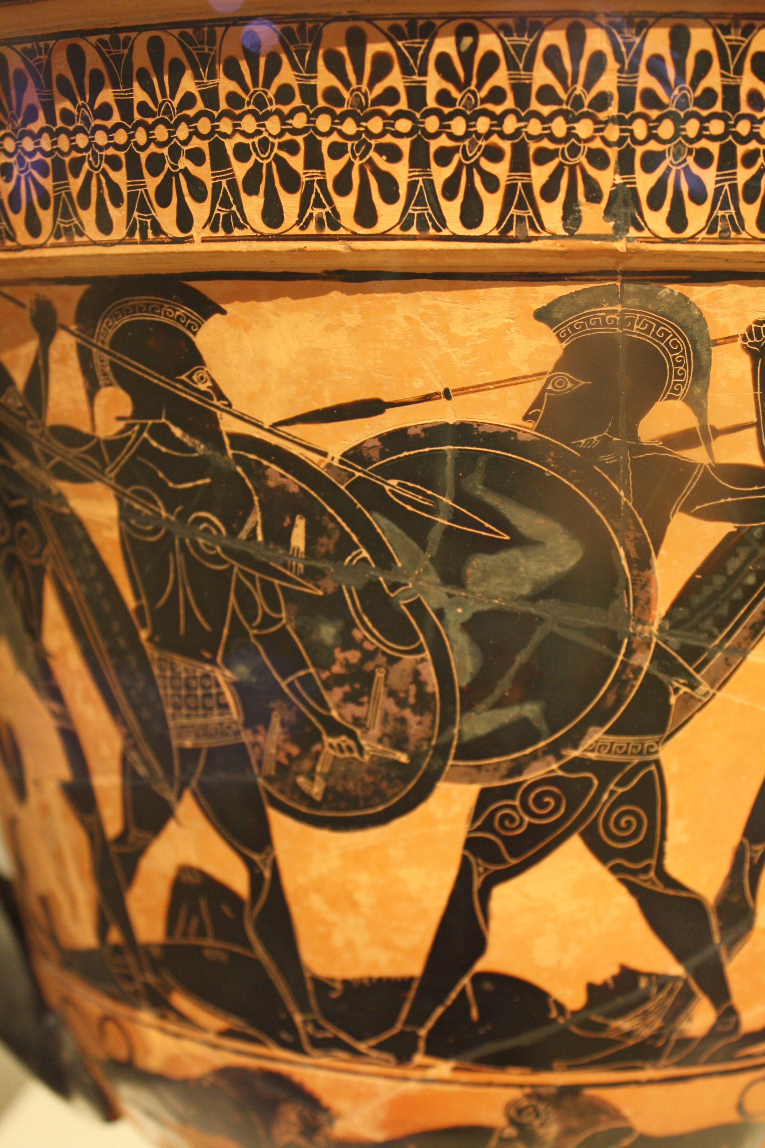 A scene depicting warriors fighting over a corpse, probably a scene from the Iliad and the fallen warrior is Patrokles. Attic black-figure kalyx krater, c. 530 BCE. (National Archaeological Museum, Athens)
