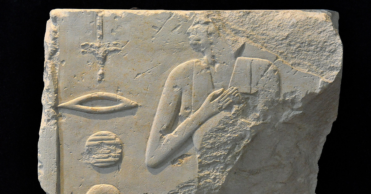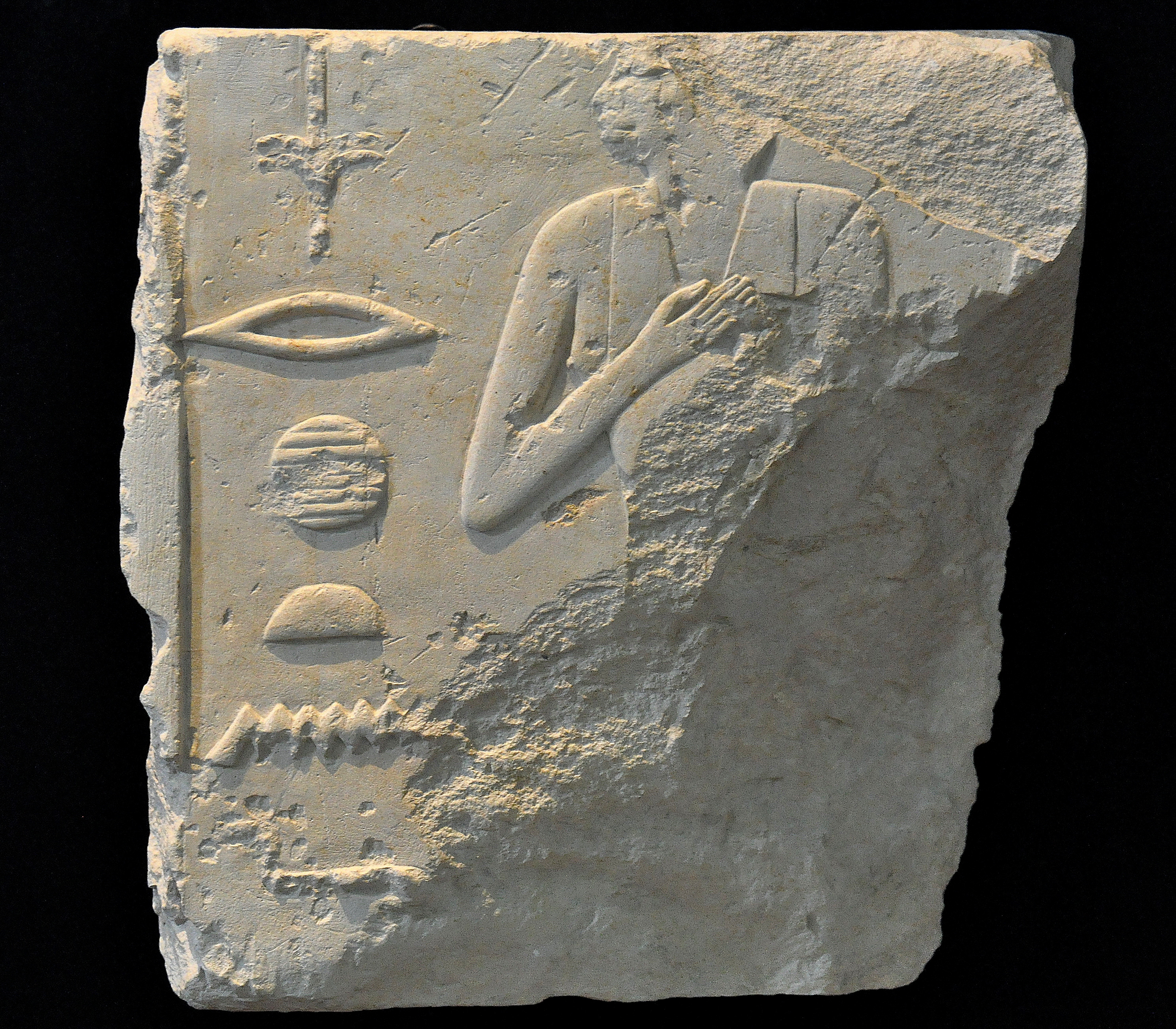 A limestone fragment of a false-door stela from the tomb of pharaoh Rahotep. From Maidum (Meidum), modern-day Egypt. Old Kingdom, circa 2600 BCE. (State Museum of Egyptian Art, Munich, Germany).