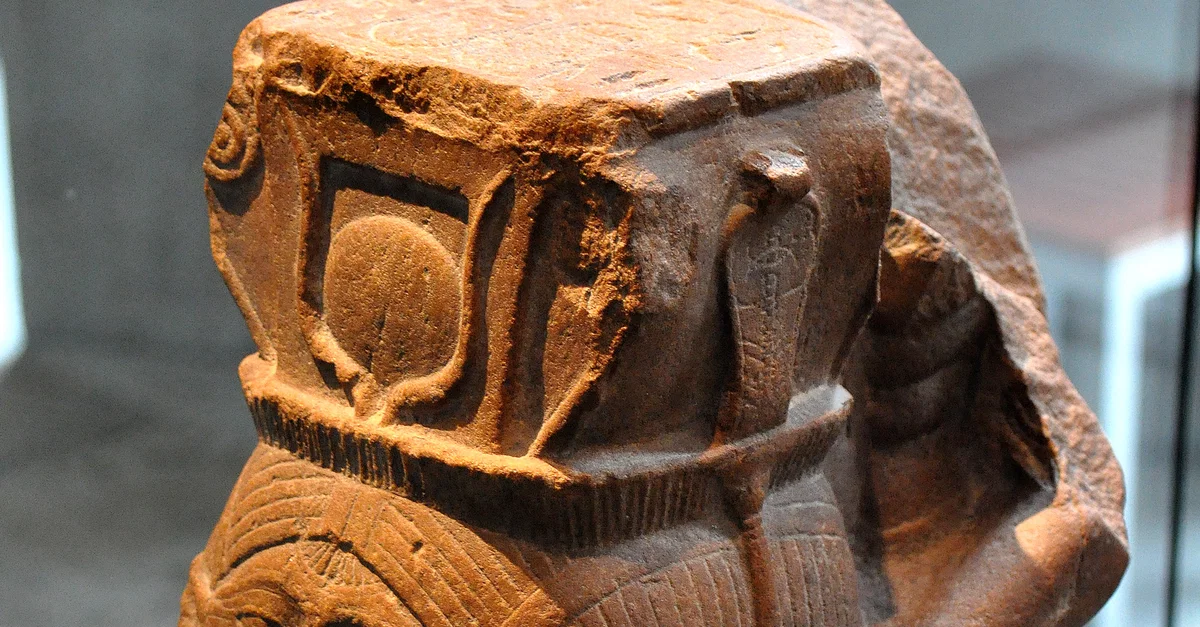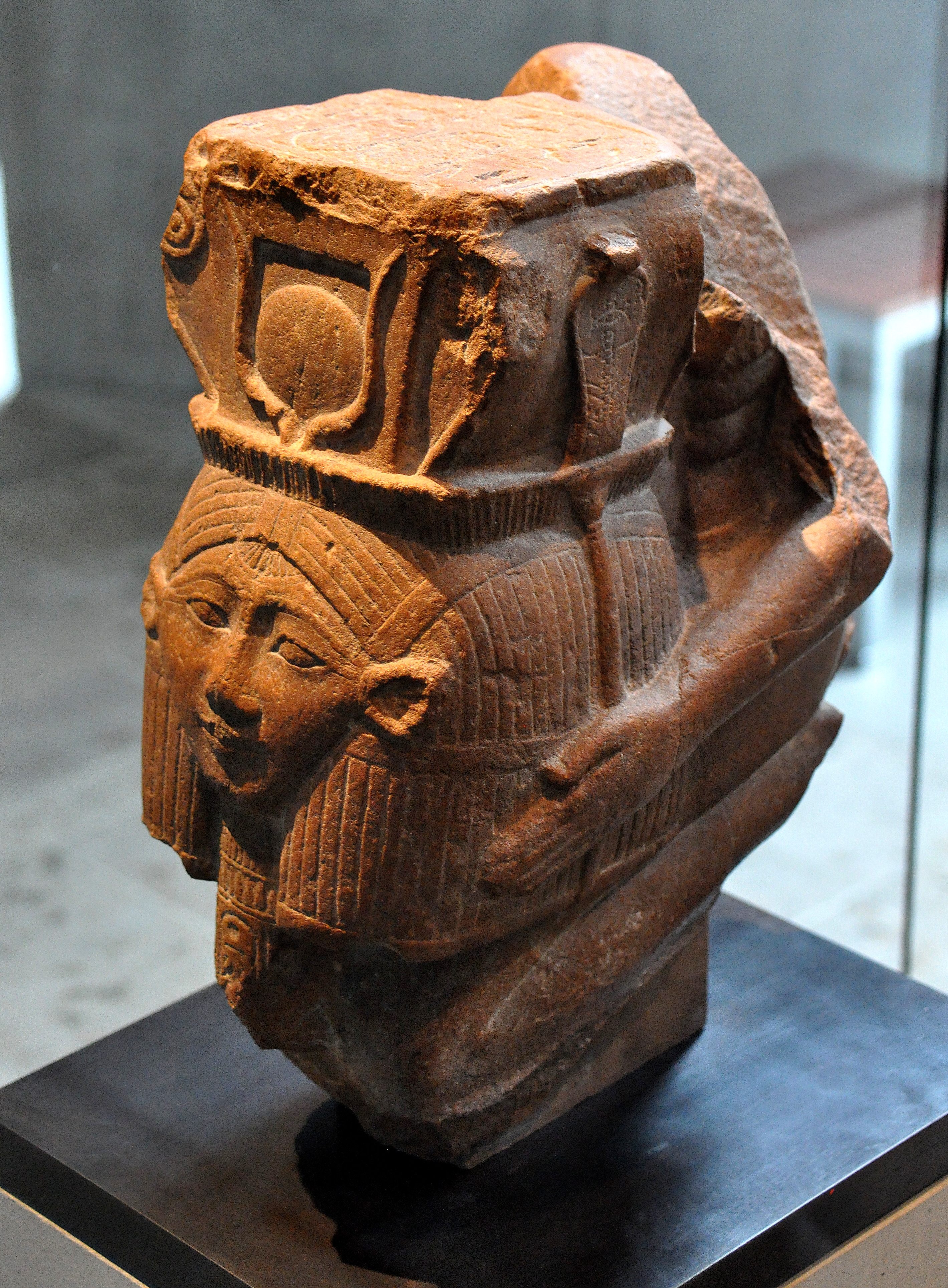 This partially damaged quartzite statue depicts the royal scribe Rekhmire. He is kneeling and holding the symbol of the goddess Hathor. From Qift, modern-day Egypt. New Kingdom, 18th Dynasty circa 1400 BCE. (State Museum of Egyptian Art, Munich, Germany).