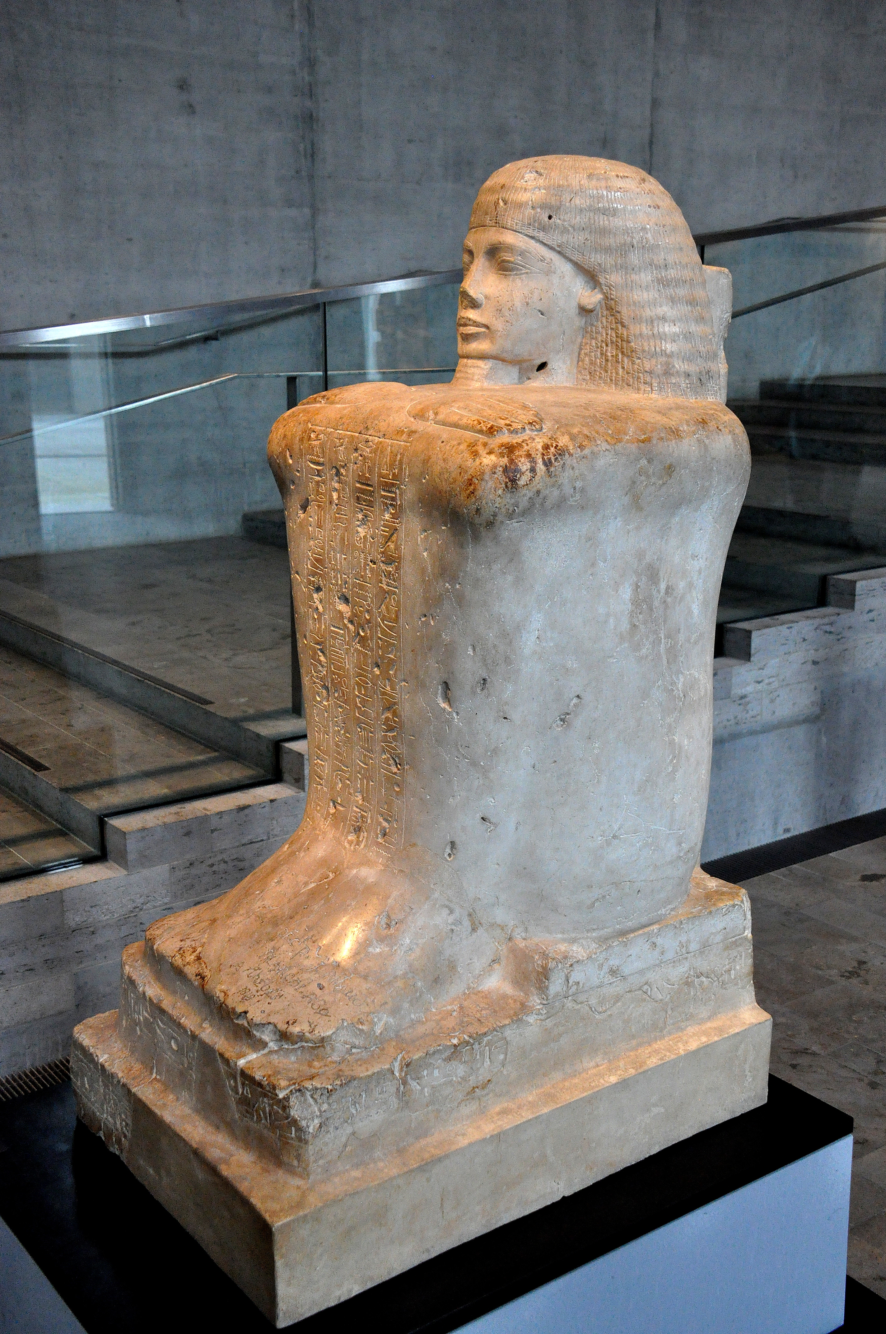 This block limestone statue depicts the high priest of Amun Bakenkhonsu. The statue dates back to the 18th Dynasty of the New Kingdom (1320 BCE) and then it was re-used during the 19th Dynasty (1220 BCE). From Karnak, Thebes, modern-day Egypt. (State Museum of Egyptian Art, Munich, Germany).