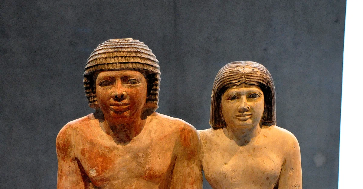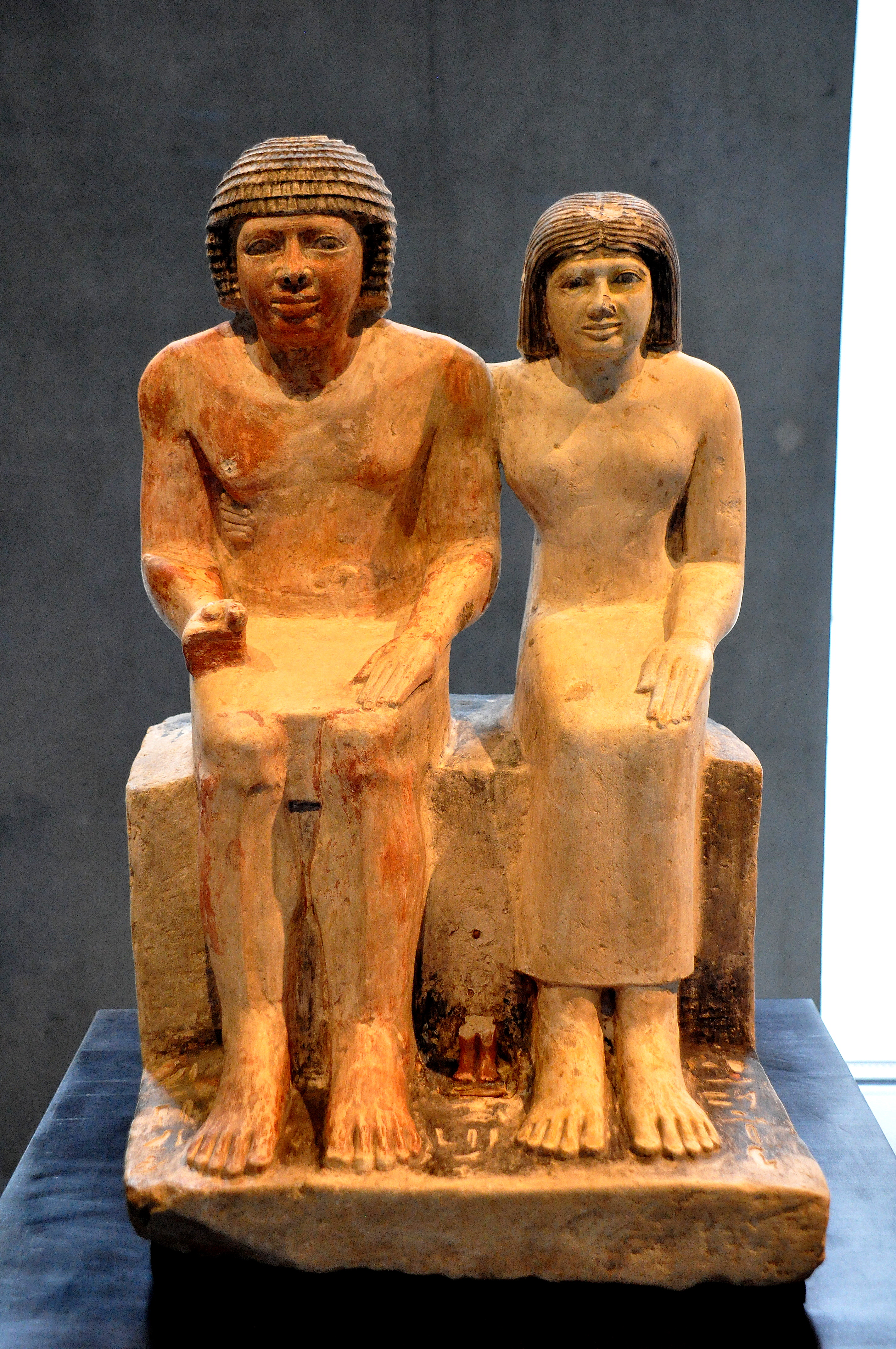 In this limestone statue, Sabu and his wife Meritites appear seated. The wife holds her husband at the lower chest. Only the lower legs of their son Iseb appear between their legs. From modern-day Egypt. Old Kingdom, 5th Dynasty, circa 2400 BCE. (State Museum of Egyptian Art, Munich, Germany).