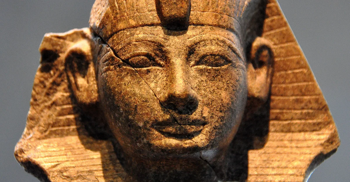 Granodiorite head of a sphinx of the Egyptian pharaoh Amenhotep II. From the cachette of Karnak temples, Egypt. New Kingdom, 18th Dynasty, 1420 BCE. (State Museum of Egyptian Art, Munich, Germany).