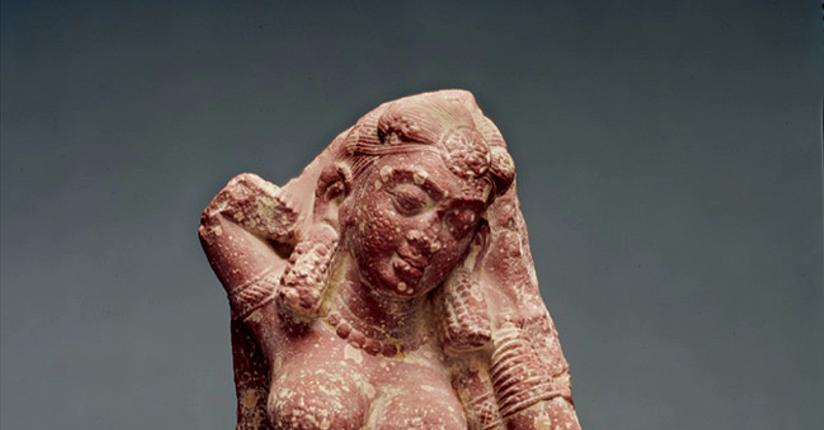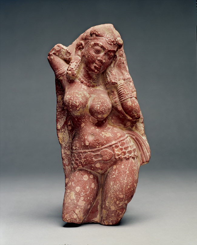Mathura region: Yakshi, ca. second century CE: sandstone. The William A. Whitaker Foundation Art Fund. Republished with permission from the Ackland Art Museum. Credit: 84.2.1 Unidentified Artist Indian, Mathura region: Yakshi, 2nd century, Sanstone, 17 7/16 x 5 3/4 x 3 1/2 in (44.29 x 14.61 x 8.89 cm) Ackland Art Museum, University of North Carolina at Chapel Hill. The William A. Whitaker Foundation Art Fund.