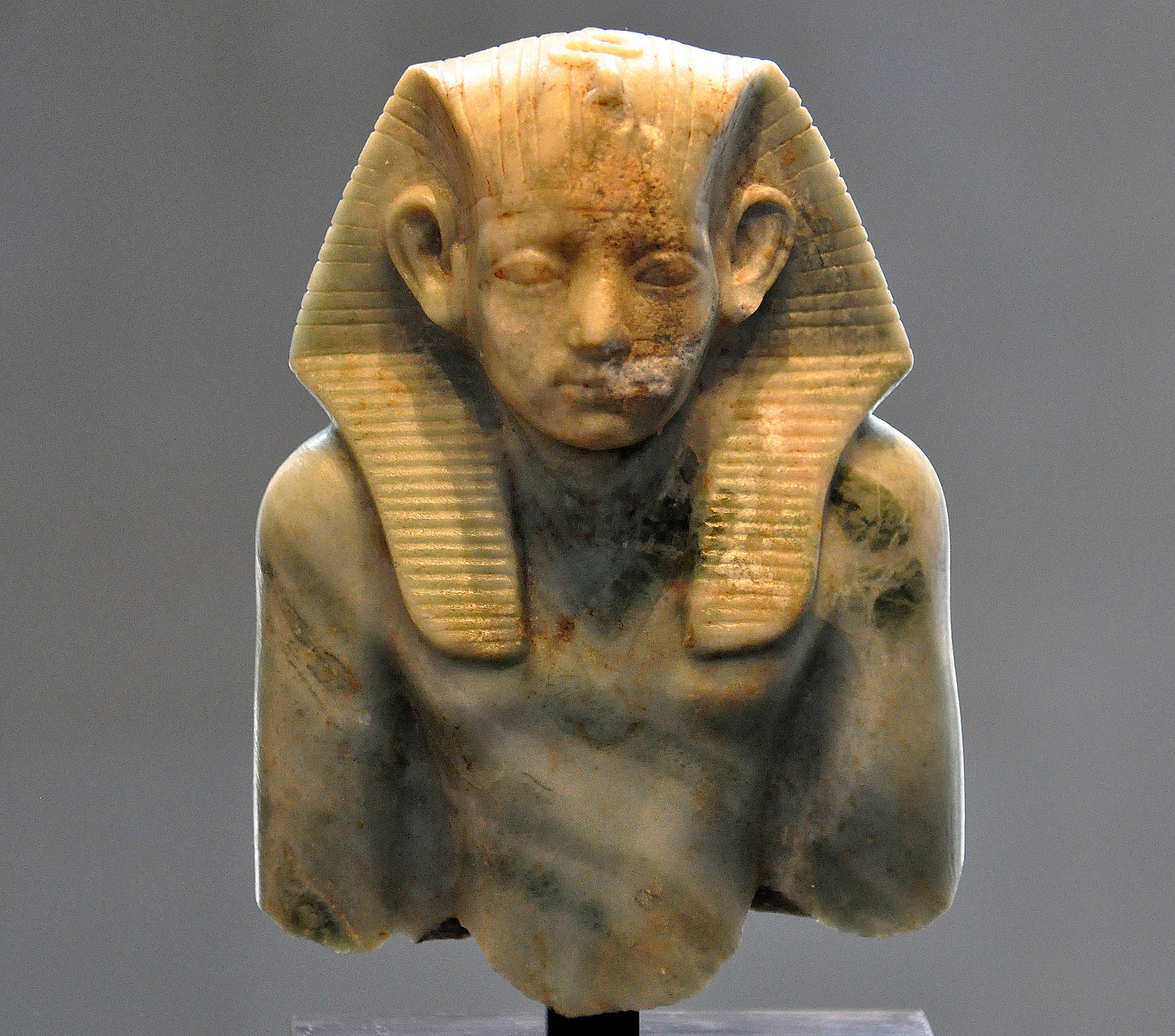 In this ophicalcite statue, only the upper half of a seated figure of the Egyptian pharaoh Amenemhat III has survived. Probably from Faiyum, modern-day Egypt. Middle Kingdom, 12 Dynasty, circa 1800 BCE. (State Museum of Egyptian Art, Munich, Germany).