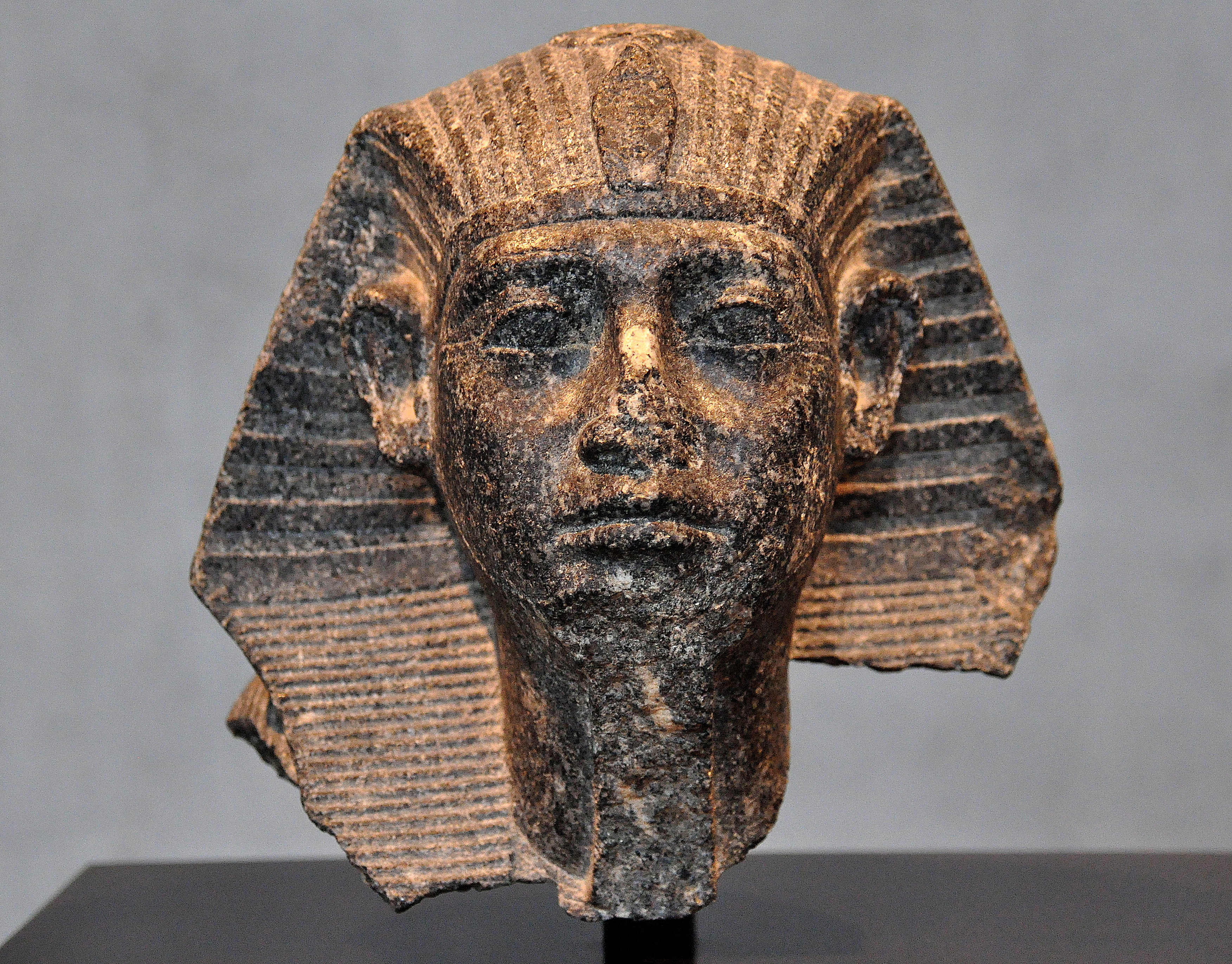 Granite head from a sphinx of the Egyptian pharaoh Senusret III with youthful features. Egypt. Middle Kingdom, 12th Dynasty, 1870 BCE. (State Museum of Egyptian Art, Munich, Germany).