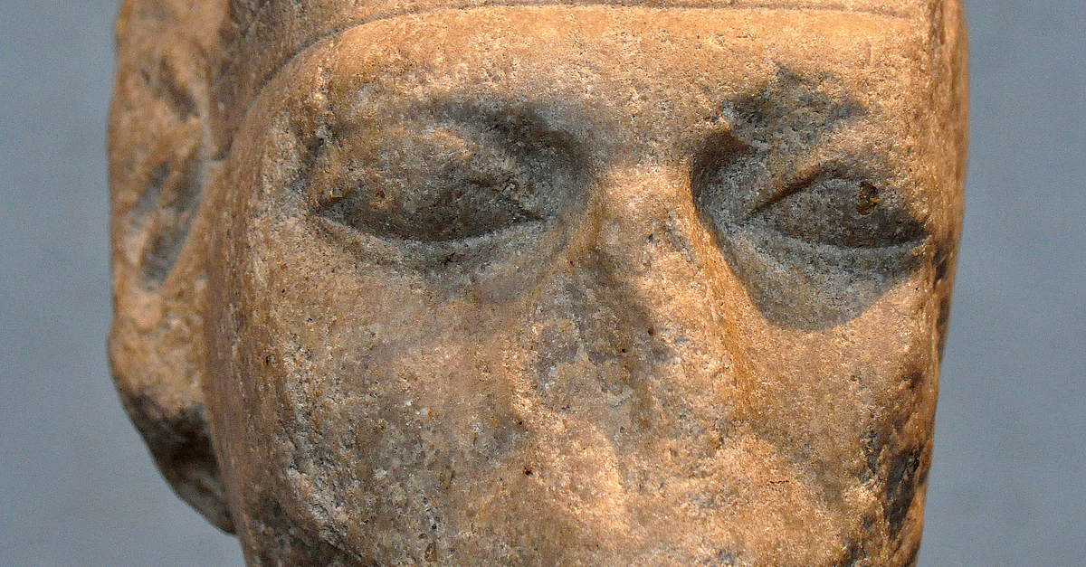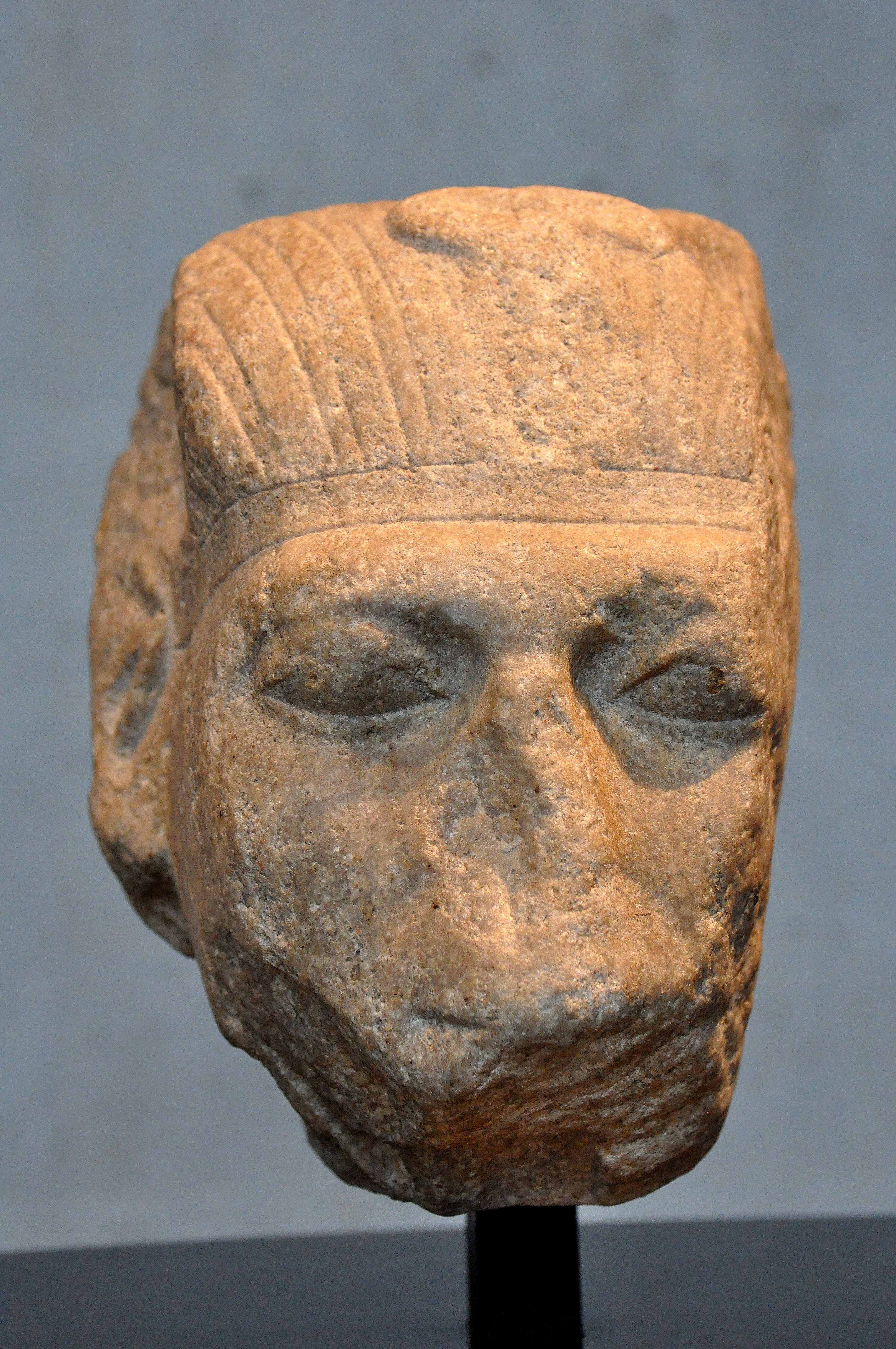Quartzite head of the Egyptian pharaoh Senusret III (aka Sesostris III) with aged features. Middle Kingdom, 12th Dynasty, 1850 BCE. (State Museum of Egyptian Art, Munich, Germany).