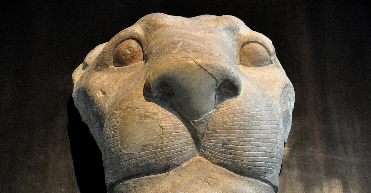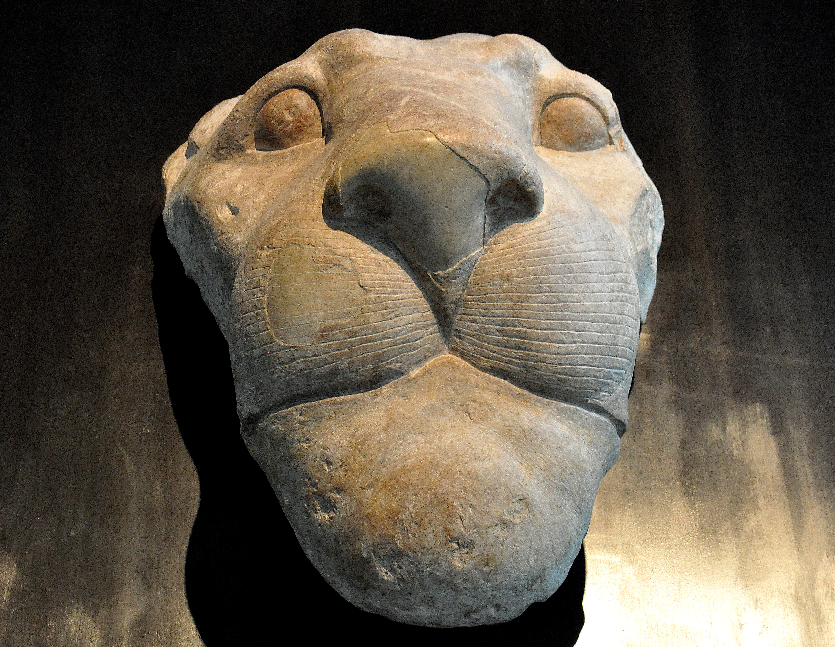 Limestone head from lion-shaped water spout, from Tell El-Dab'a, New Kingdom of Egypt, 18th Dynasty, 1450-1400 BCE.