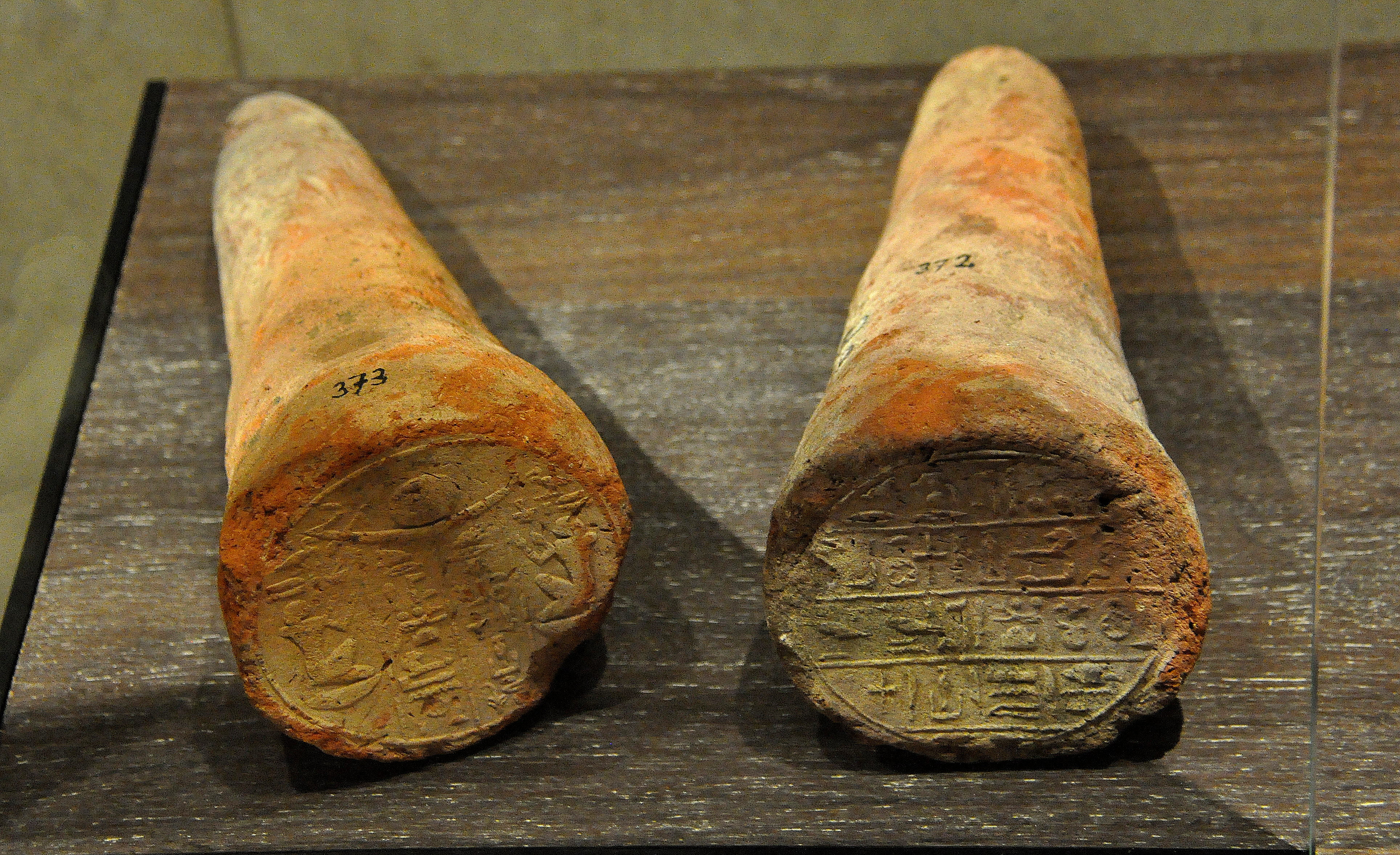 Two ceramic funerary cones of Basa, the high priest of Min of Coptos and mayor of Thebes. From Western Thebes, modern-day Egypt. Saite period, 26th Dynasty, circa 600 BCE. (State Museum of Egyptian Art, Munich, Germany).