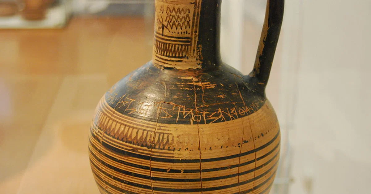 The Dipylon oinochoe inscription is a short text carved on an ancient Greek pottery vessel dated to c. 740 BC. It is one of the oldest known examples of the use of the Greek alphabet. The letters are scratched on a wine jug (oinochoe) which was in the ancient Dipylon Cemetery (Athens). The vessel is today located in the National Archaeological Museum of Athens.