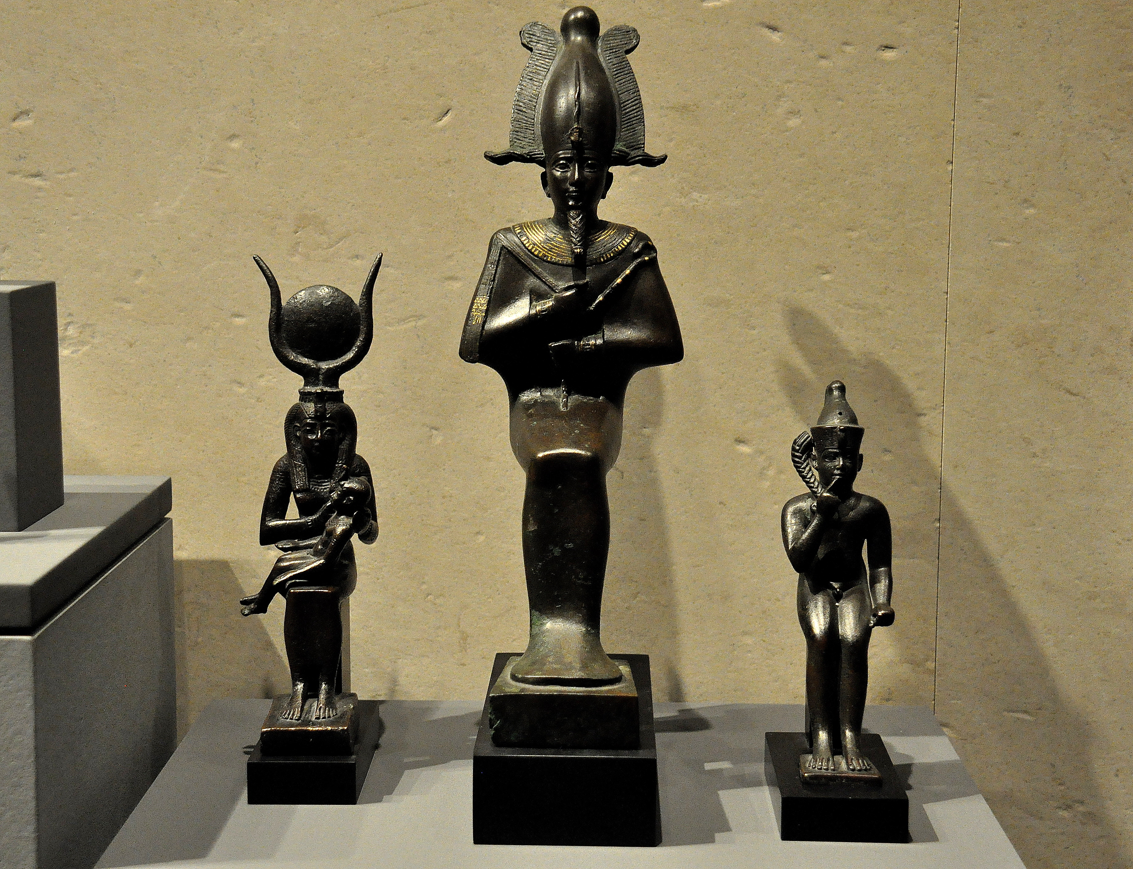 Bronze collection of divine figures: the goddess Isis (left) with the child Horus, the god Osiris (middle), and the god Harpokrates (right) wearing the double crown. Egypt, Saite period to Ptolemaic period, 7th to 4th centuries BCE.