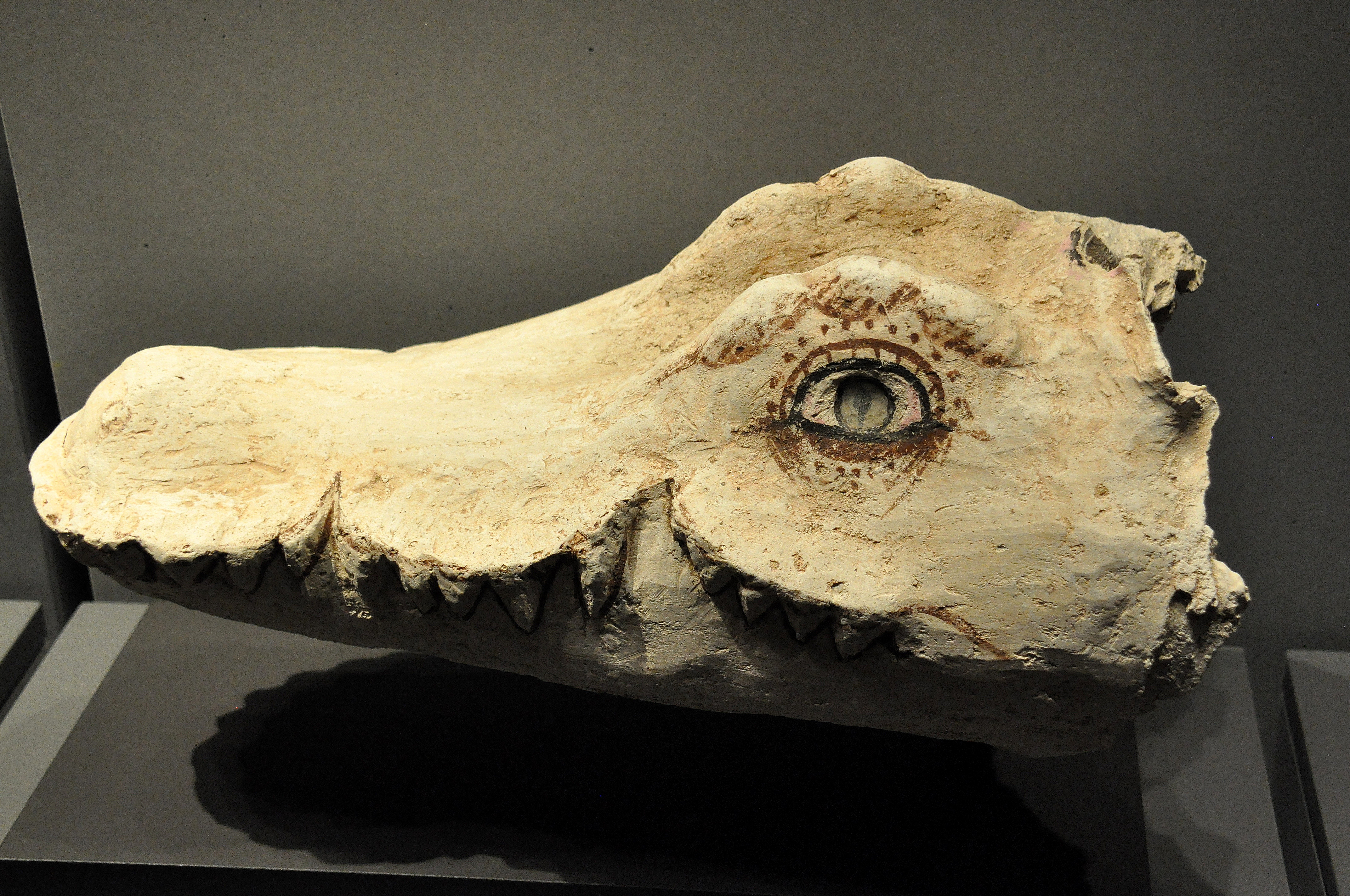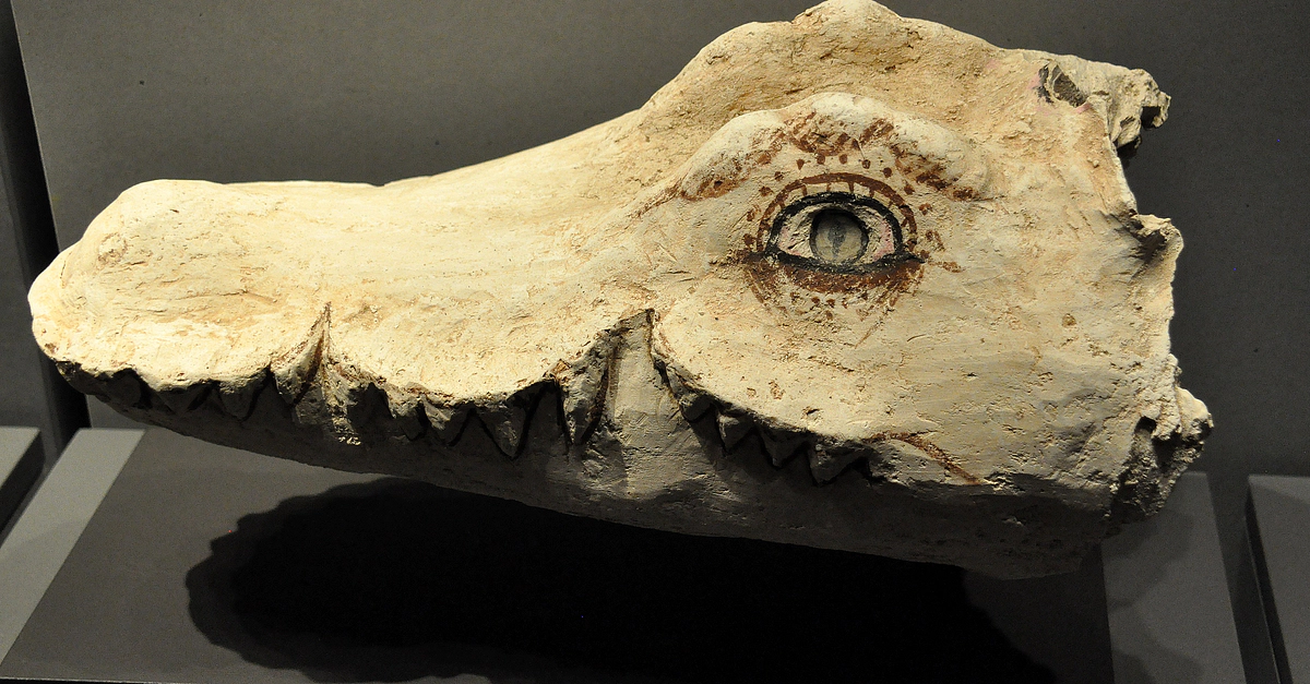 Mummy mask for a crocodile with traces of mummy wrapping inside. Stucco, linen, and glass. From modern-day Egypt. Roman period, 1st and 2nd centuries CE. (State Museum of Egyptian Art, Munich, Germany).