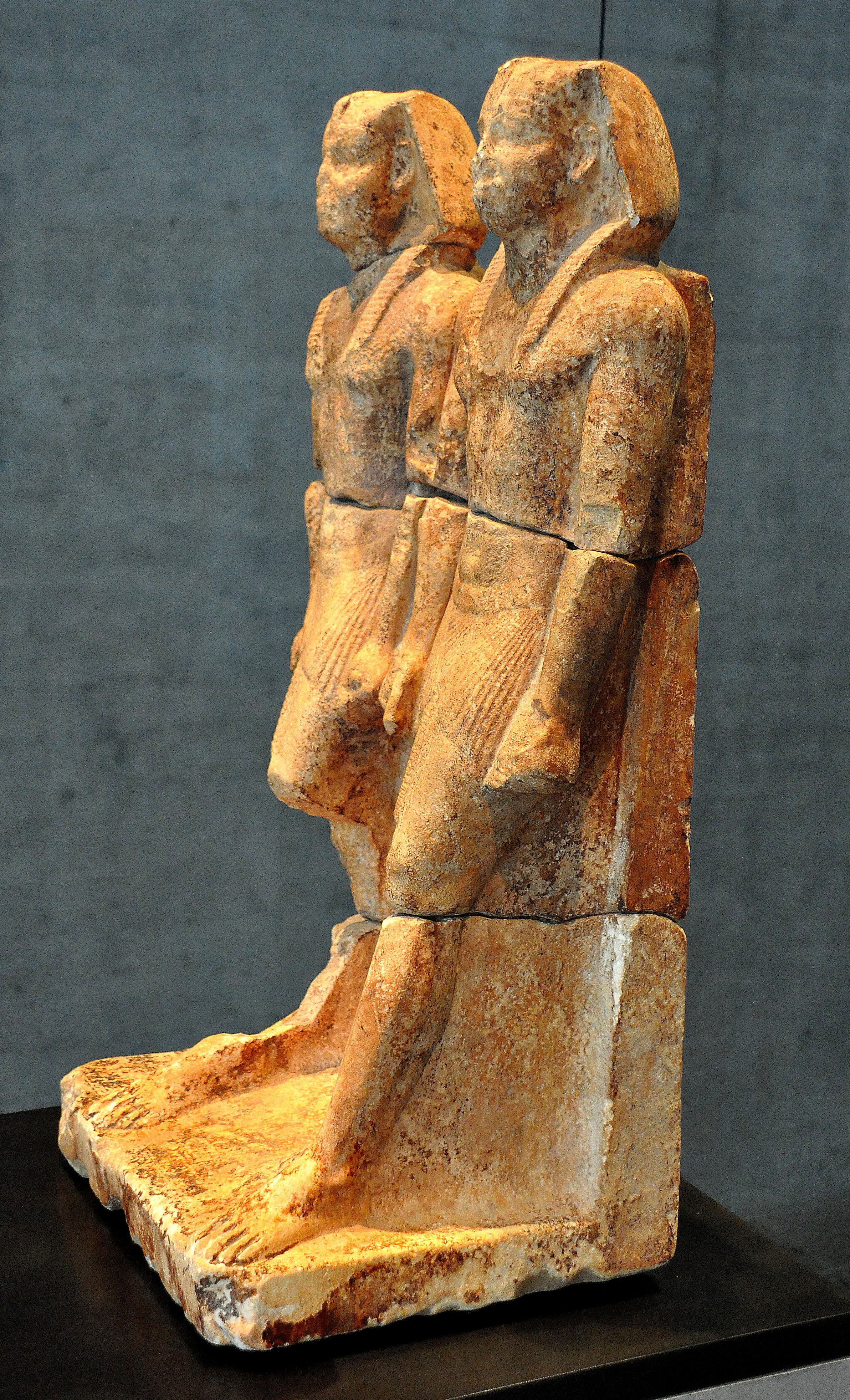 Calcite double statue of the Egyptian pharaoh Niuserre (also written Nyuserre Ini, Neuserre Izi, or Niuserre Isi). He stands and strides. The pharaoh is depicted as an old man and a young man. From modern-day Egypt. Old Kingdom, 5th Dynasty, circa 2390 BCE. (State Museum of Egyptian Art, Munich, Germany).