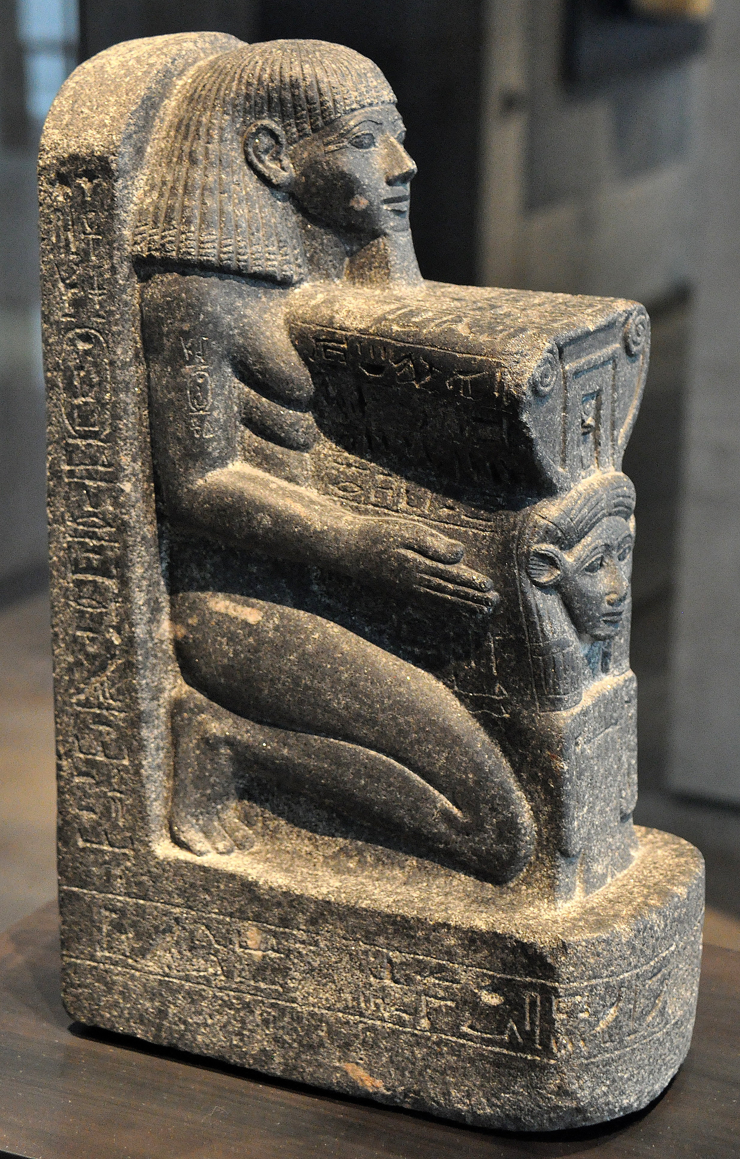 Granite statue of the kneeling figure of the architect Senenmut (also written Senmut or Senmout). He holds a symbol of the goddess Hathor. From Armant (ancient Hermonthis), modern-day Egypt. New Kingdom, 18th Dynasty, circa 1470 BCE. (State Museum of Egyptian Art, Munich, Germany).