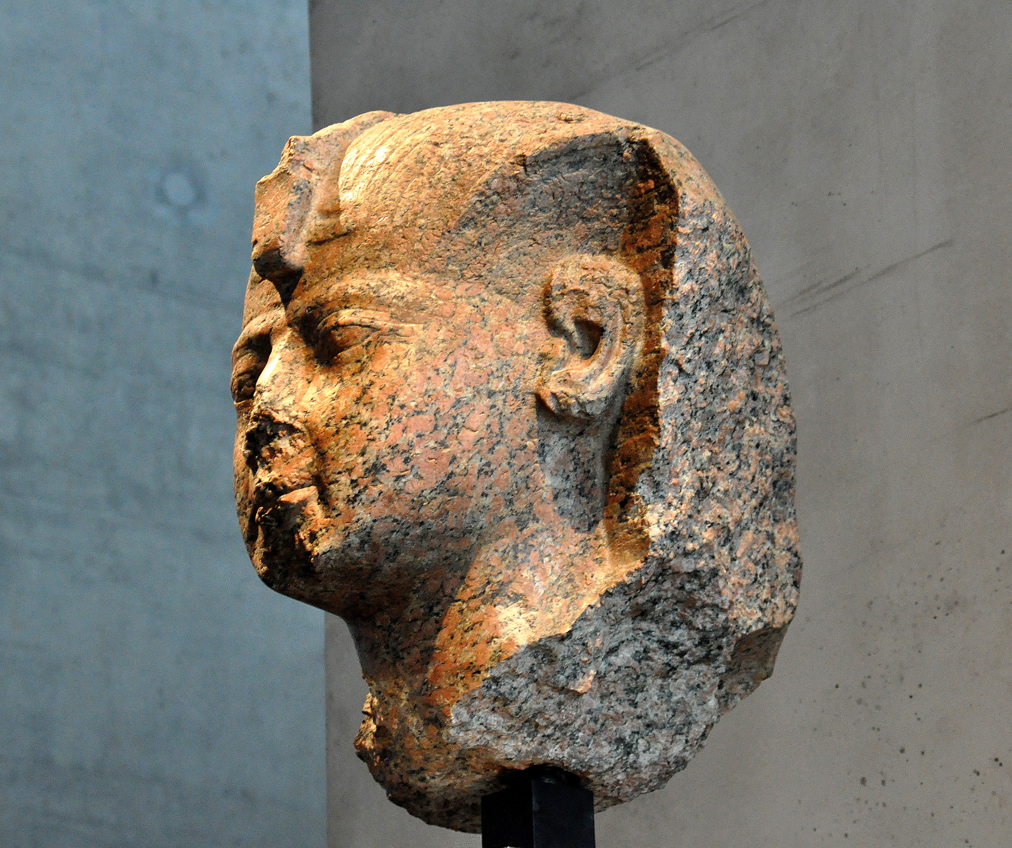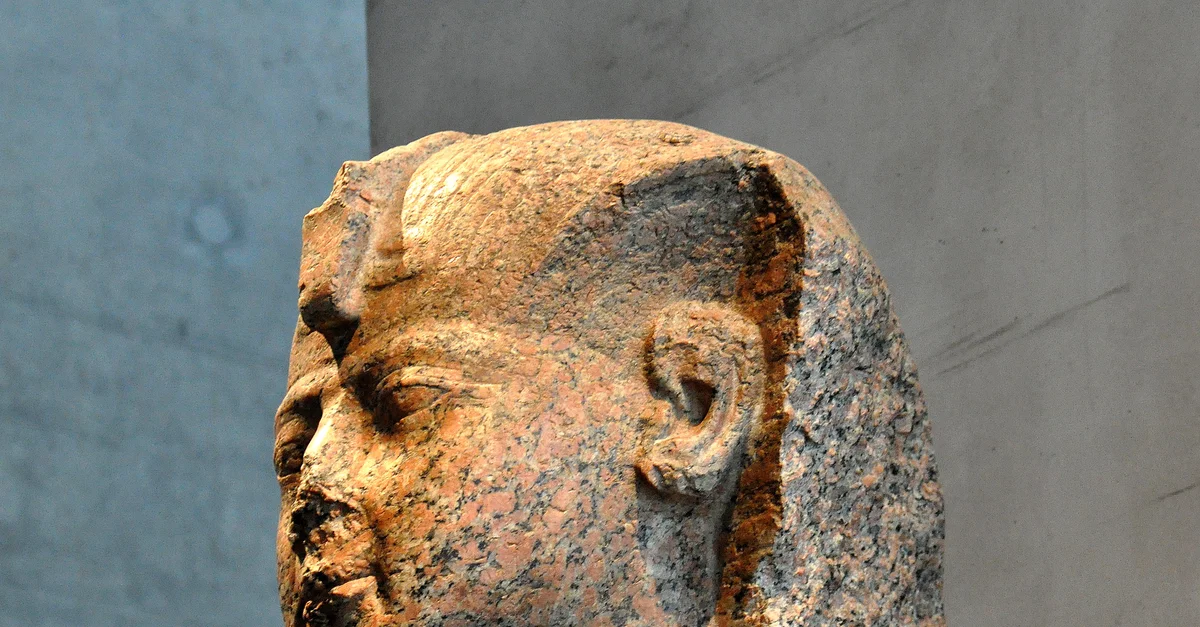 Rose granite head of the statue of queen Hatshepsut. She wears the royal headdress and was depicted as a pharaoh. From modern-day Egypt. New Kingdom, 18th Dynasty, circa 1460 BCE. (State Museum of Egyptian Art, Munich, Germany).