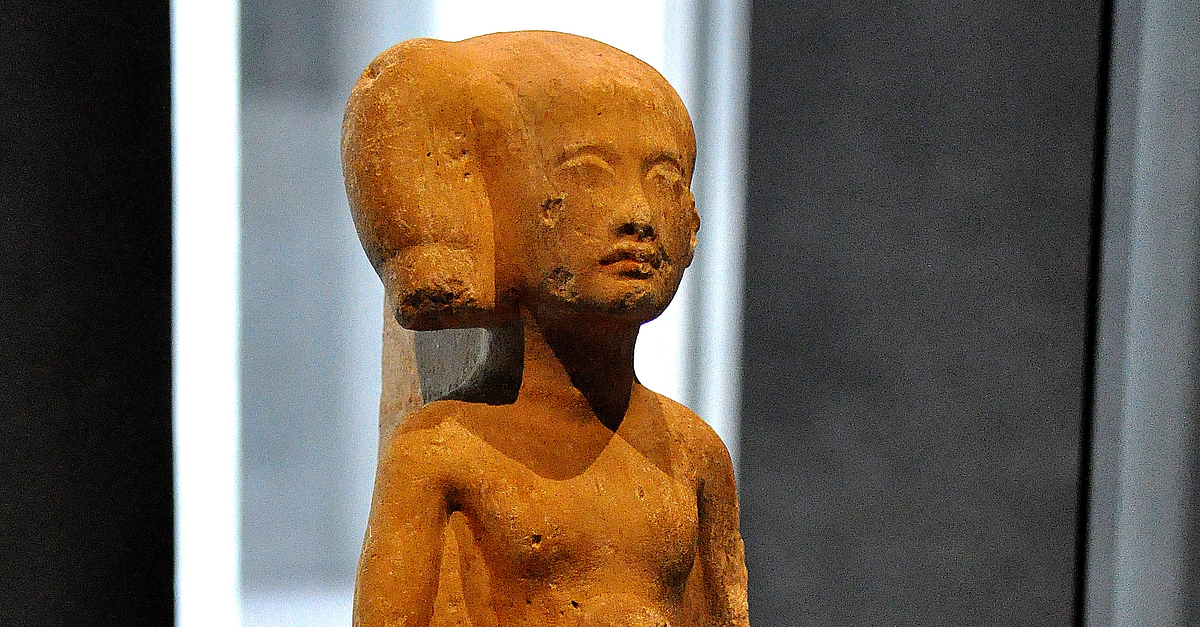 Limestone statue of a standing-striding figure of a daughter of the Egyptian pharaoh Akhenaten. From modern-day Egypt. New Kingdom, 18th Dynasty, 1345 BCE. (State Museum of Egyptian Art, Munich, Germany).