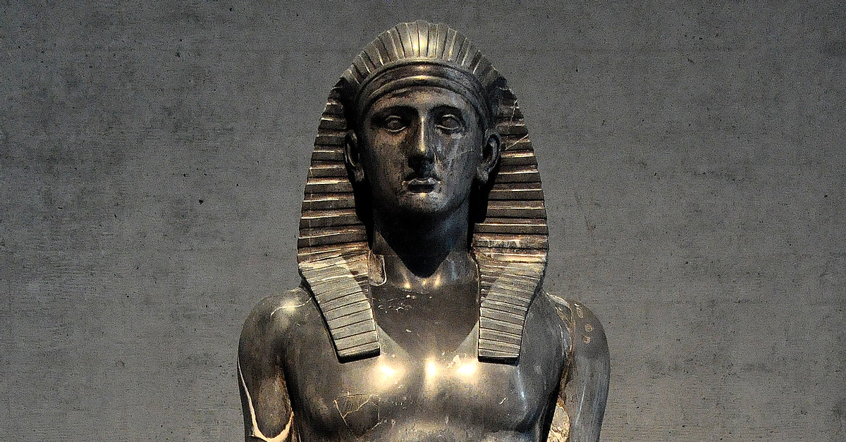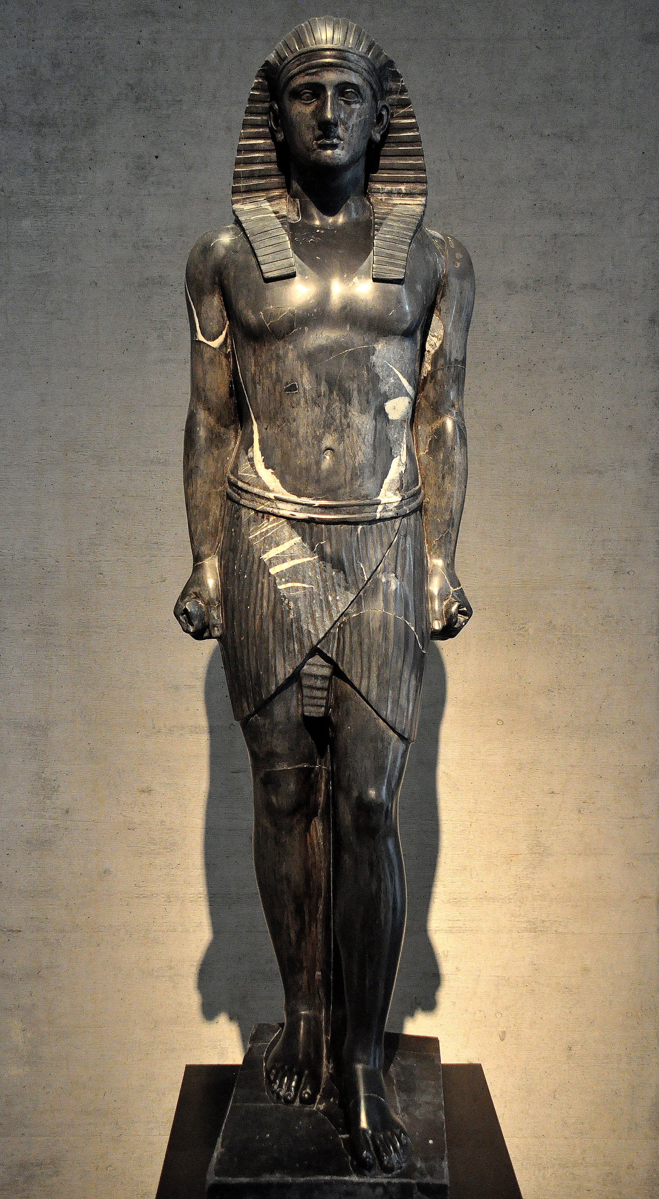 This marble statue depicts a standing-striding royal man with an Egyptianized style and was found at Hadrian's villa (Tivoli), Italy. Roman period, circa 135 CE.(State Museum of Egyptian Art, Munich, Germany).