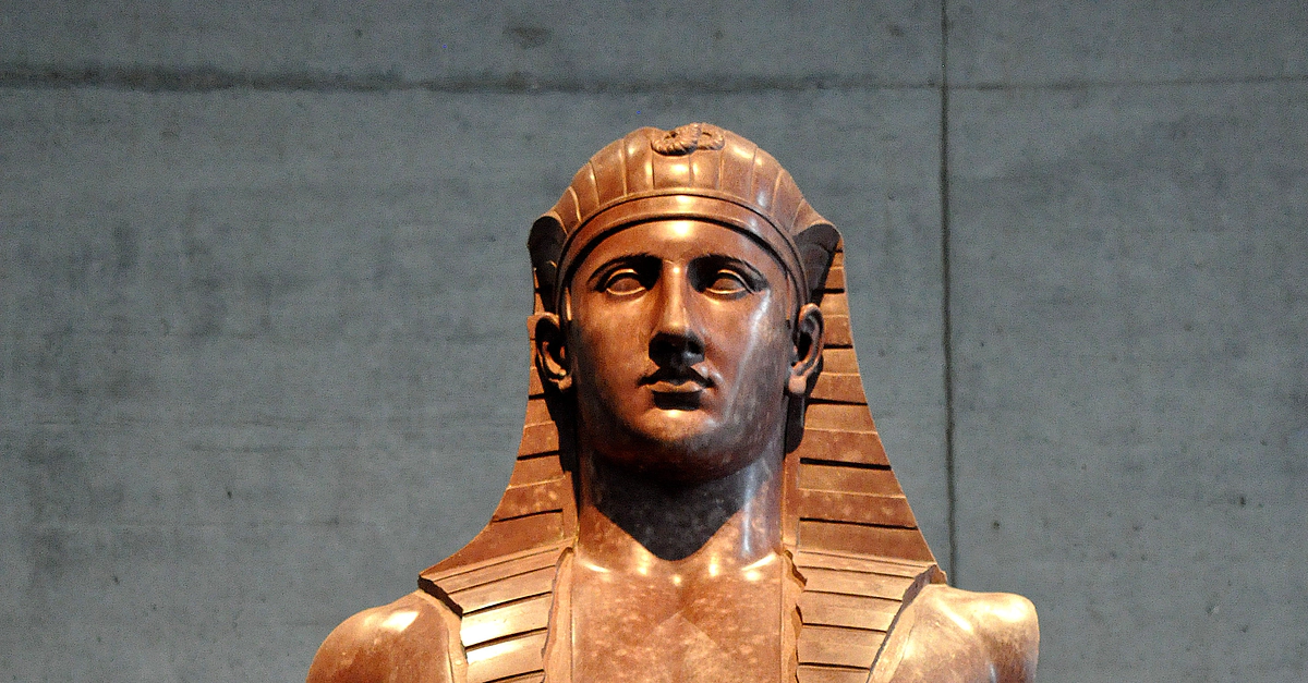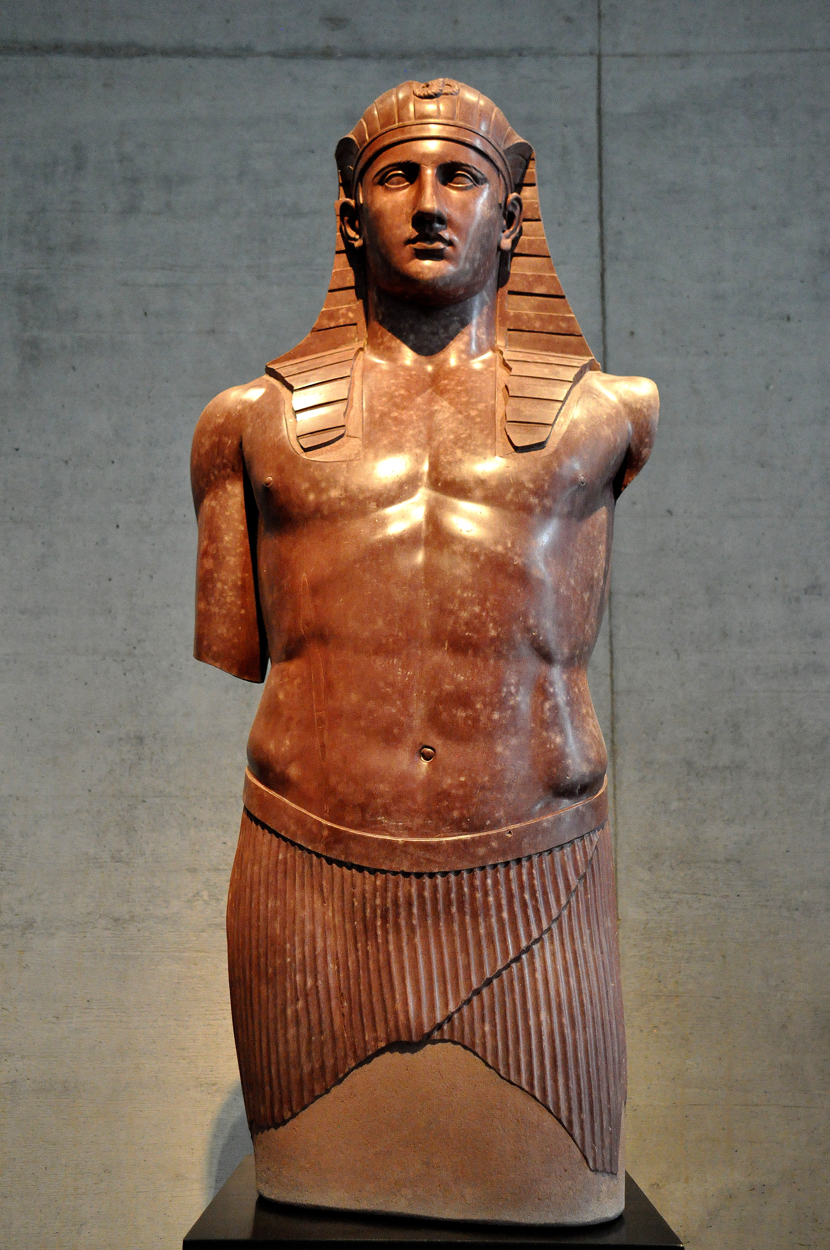 This marble statue depicts a standing-striding man with an Egyptianized style; he is Antinous, a favorite of emperor Hadrian. It was found at the Hadrian's villa (Tivoli), modern-day Italy. Roman period, circa 135 CE.(State Museum of Egyptian Art, Munich, Germany).