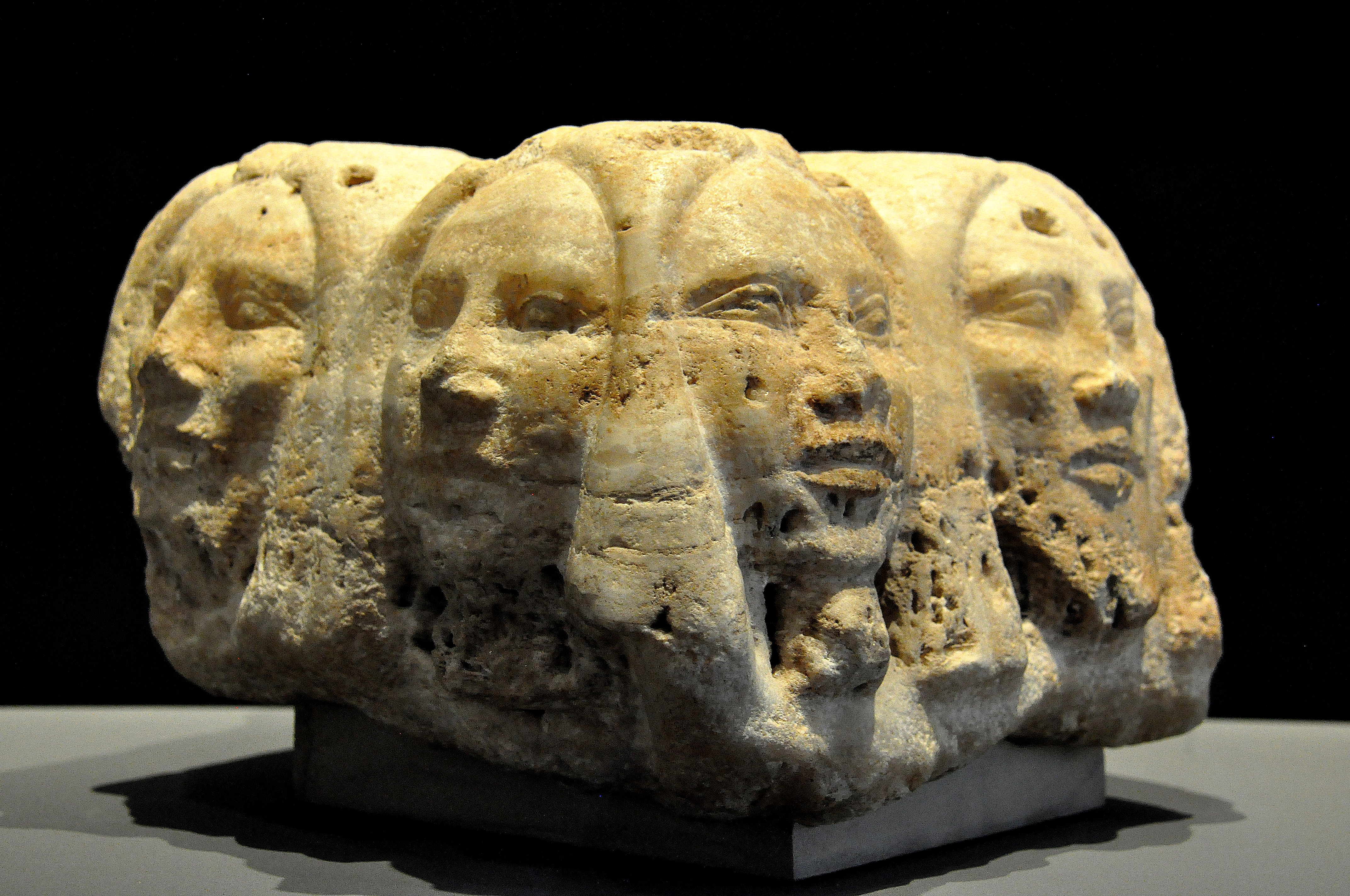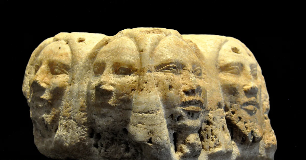 Base of a calcite royal statue. It depicts four heads of foreigners. From modern-day Egypt. Proto-historical period, 2nd Dynasty, circa 2700 BCE. (State Museum of Egyptian Art, Munich, Germany).