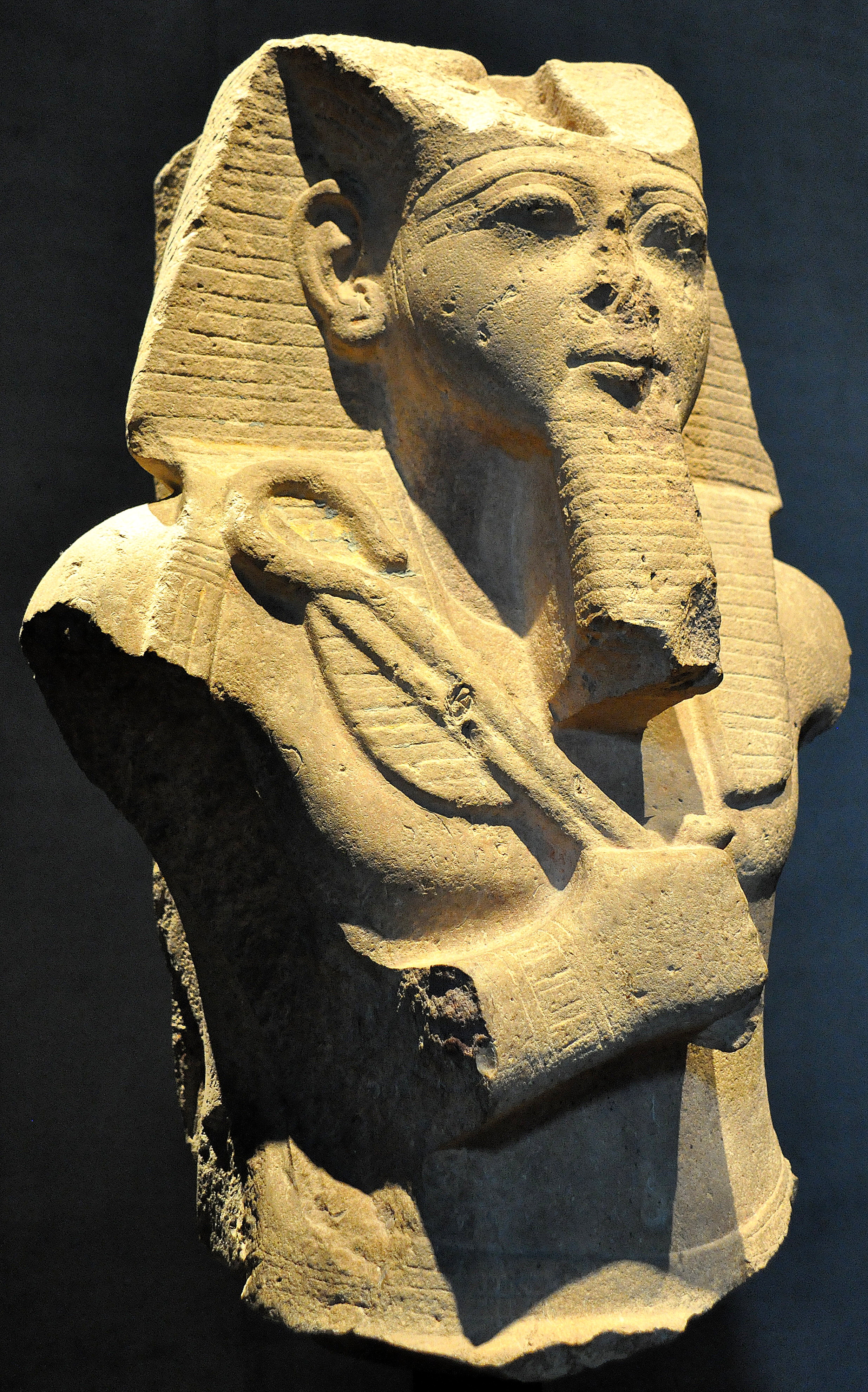 Sandstone statue of the upper half of the seated figure of the Egyptian pharaoh Ramesses II. The lower half is lost. The king holds a crook and a flail. From Nubia, modern-day lower Egyptian and upper Sudanese areas. New Kingdom, 19th Dynasty, 1240 BCE. (State Museum of Egyptian Art, Munich, Germany).