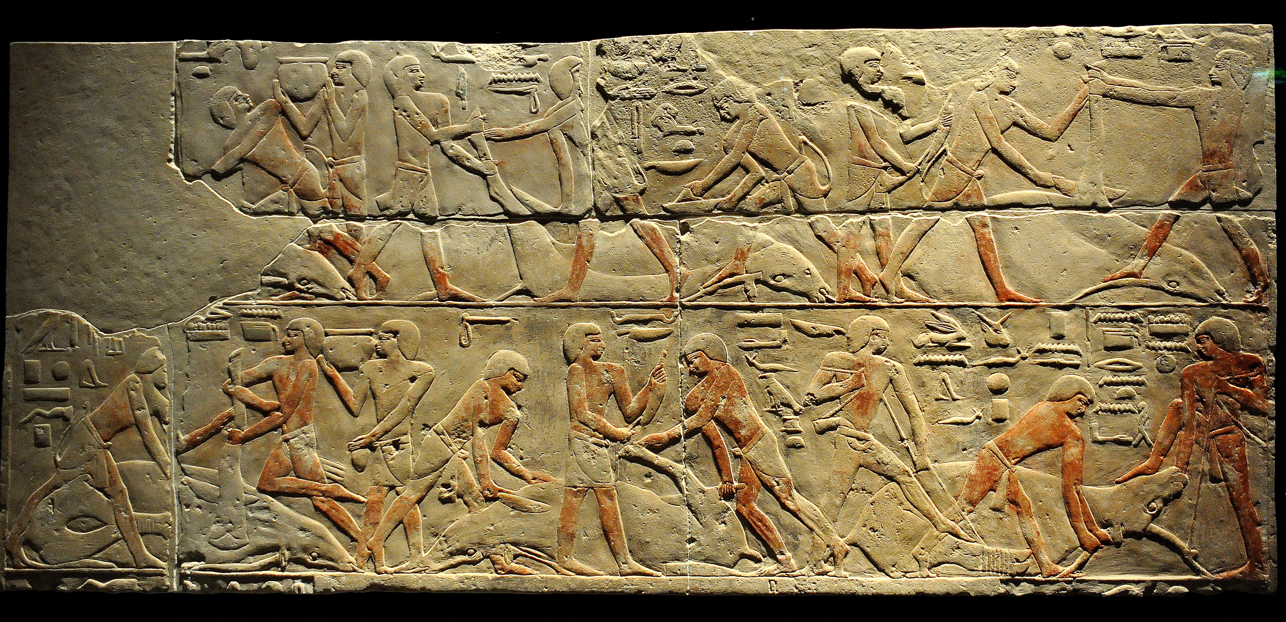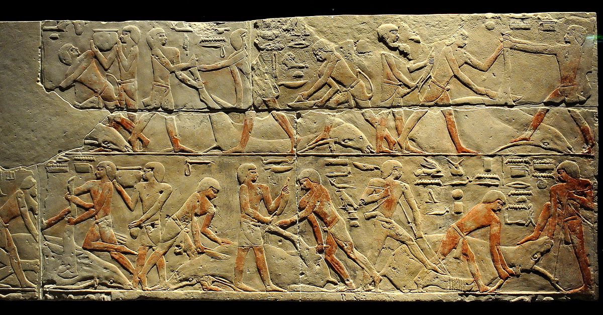 Limestone relief depicting men slaughtering cows. From the tomb of Nianchnesut, Saqqara (Sakkara), modern-day Egypt. Old Kingdom, 5th-6th Dynasties, circa 2300 BCE. (State Museum of Egyptian Art, Munich, Germany).