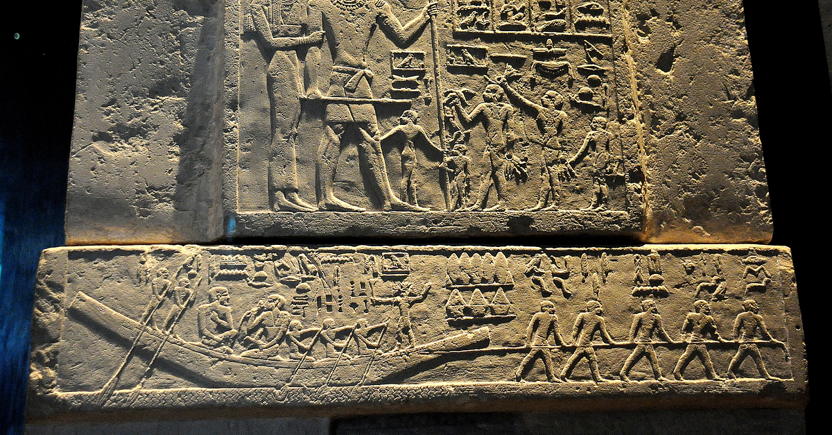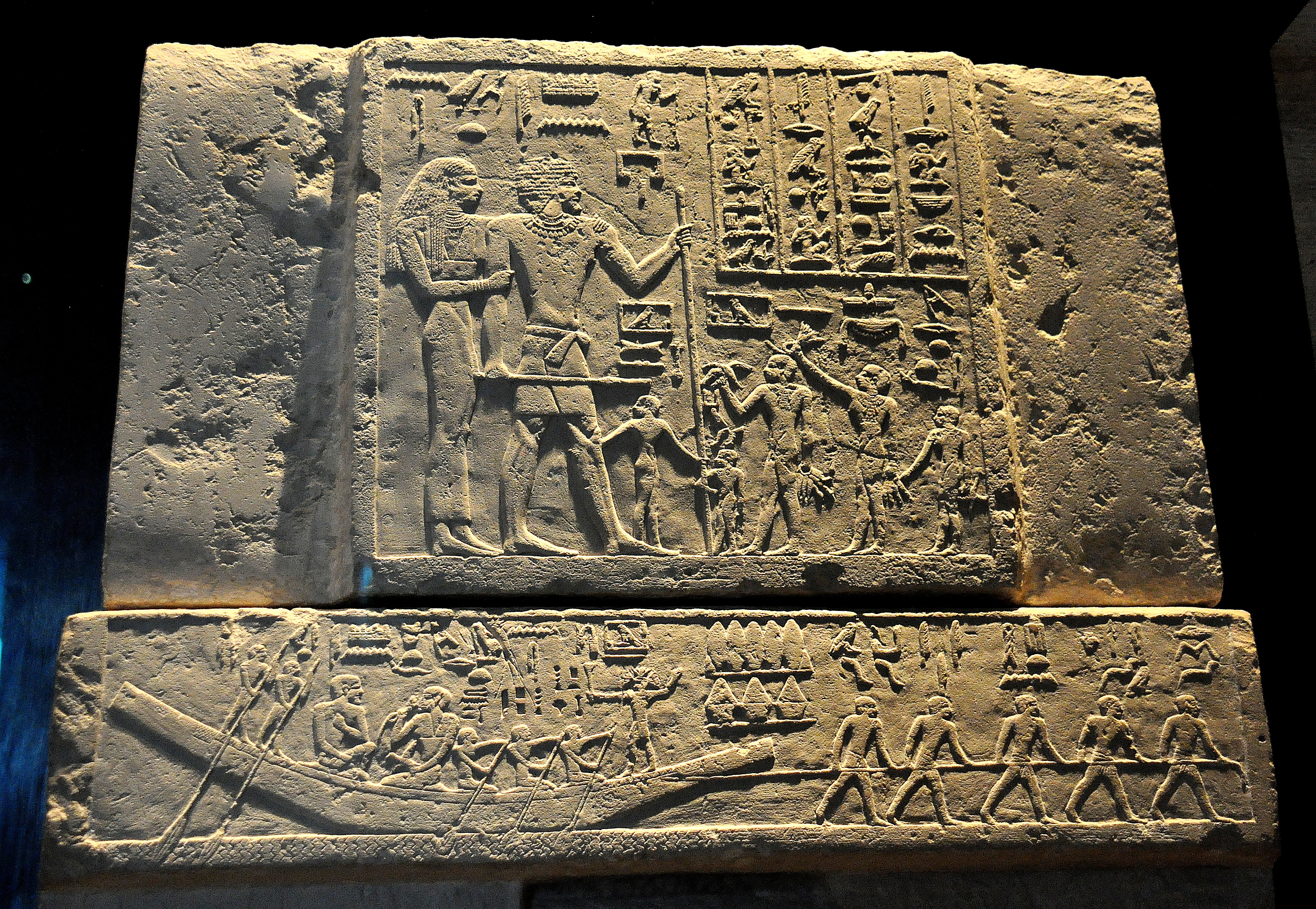 Limestone fragments of the false-door stela of the tomb of Meni. From Giza, modern-day Egypt. Old Kingdom, 6th Dynasty, circa 2200 BCE. (State Museum of Egyptian Art, Munich, Germany).