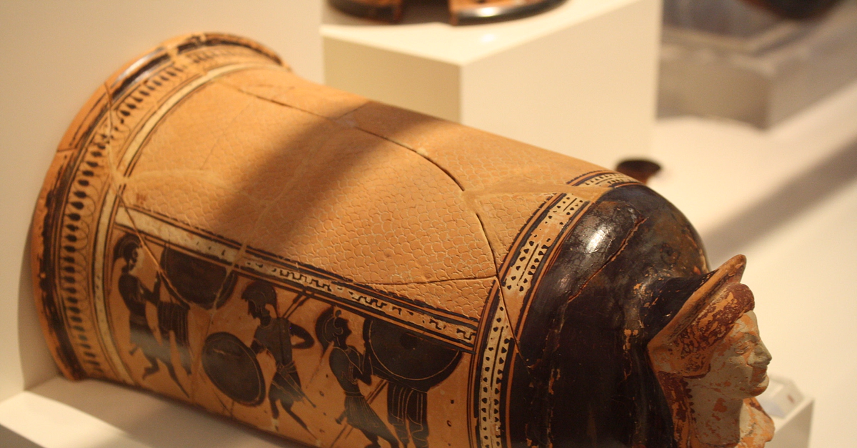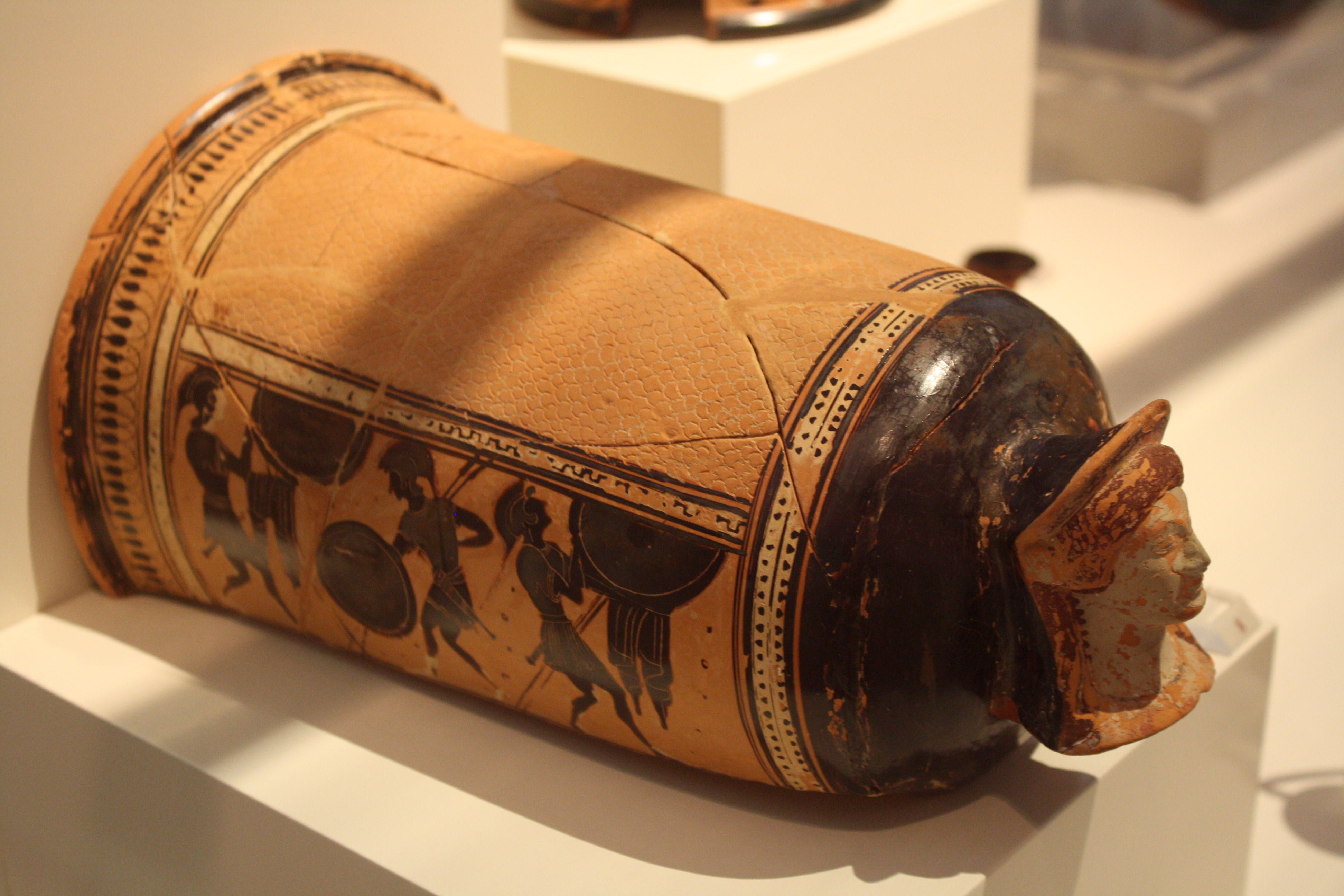 Epinetron (pl. epinetra) - a half-cyclinder worn over the thigh with the closed end over the knee, used for preparing wool for weaving. The upper surface was often incised to make a rough surface against which the wool fibres could be rubbed. Often with a female head at the closed end. This example depicts black-figure amazons and is from Boeotia. Attributed to the Sappho pianter, 500-490 BCE. (National Archaeological Museum, Athens)