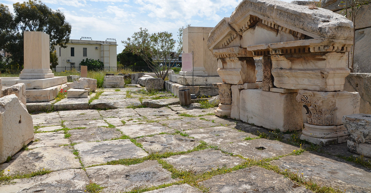 The ruins of the East Triumphal Arch built by Antoninus Pius in the 2nd century CE outside the Sanctuary of Demeter and Kore at Eleusis.