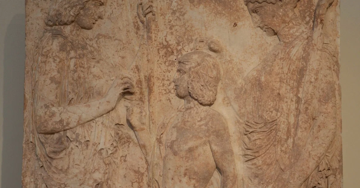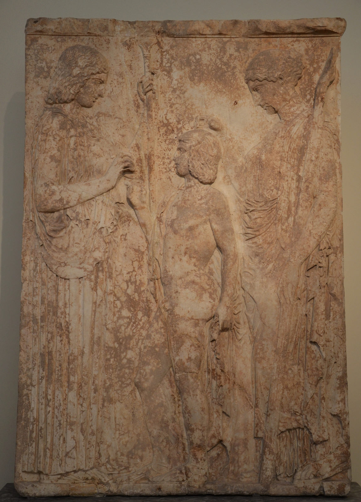 This is the largest and most important votive relief found at Eleusis. It represents the Eleusinian deities in a scene of mysterious rituel. On the left Demeter, clad in a peplos and holding a scepter in her left hand, offers ears of wheat to Triptolemos, son of Eleusinian king Keleos, to bestow on mankind. On the right Persephone, clad in a chiton and mantle and holding a torch, blesses Triptolemos with her right hand. This relief, dating to c. 440-430 BCE, was apparently famous in antiquity and was copied in the Roman period. (Archaeological Museum of Athens, Greece)