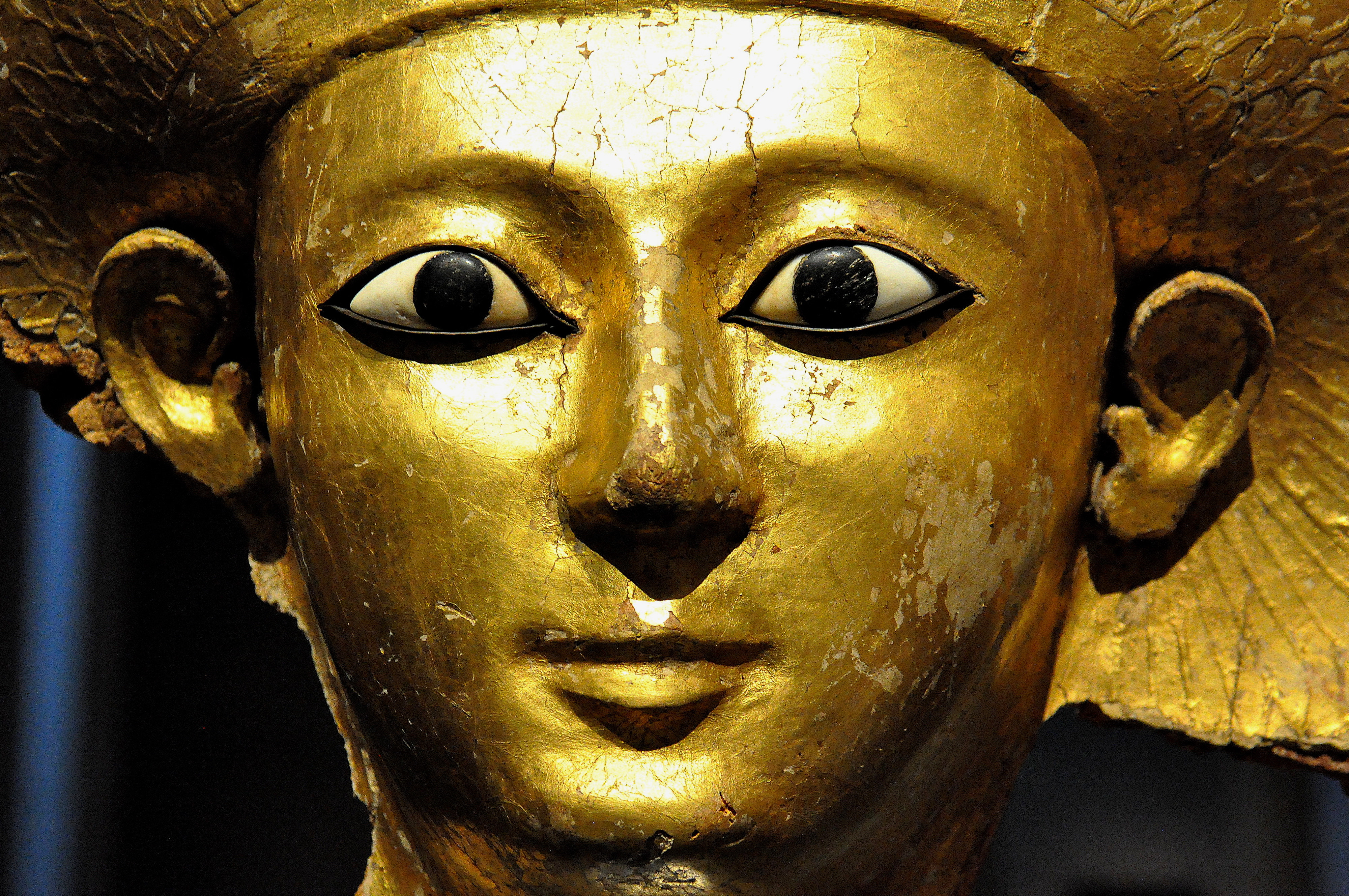 Sitdjehuti was a sister and daughter of Egyptian pharaohs. This is a close-up view of the upper part of her coffin, which was made of gold-plated sycamore wood and stucco. From Western Thebes, modern-day Egypt. 17th Dynasty, circa 1575 BCE. State Museum of Egyptian Art, Munich, Germany.
