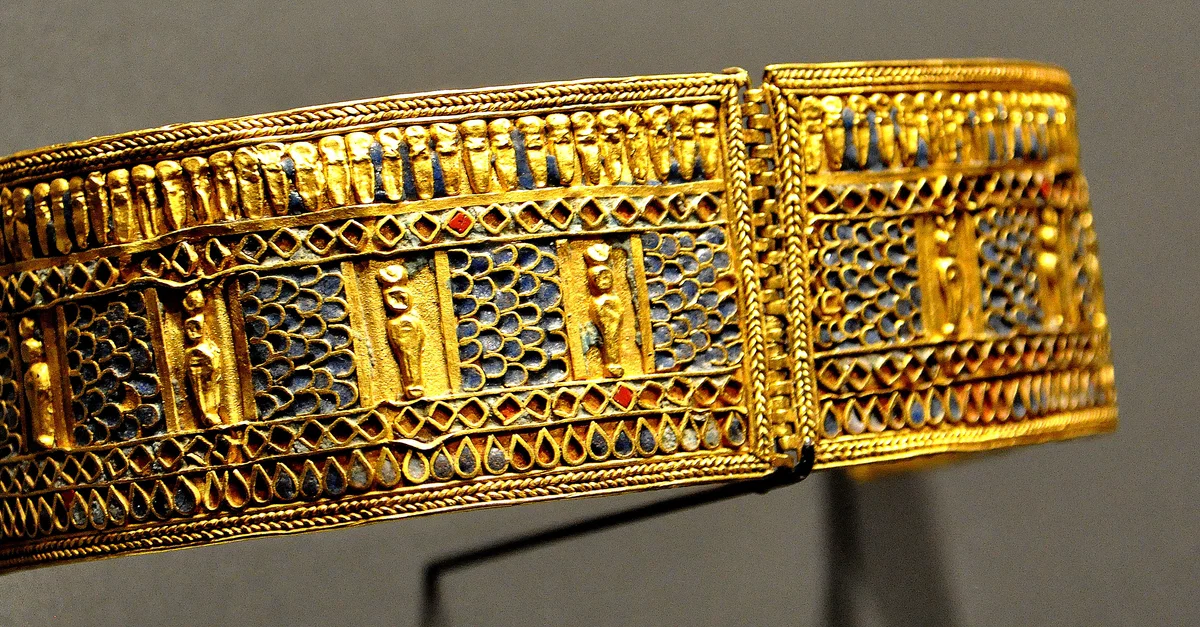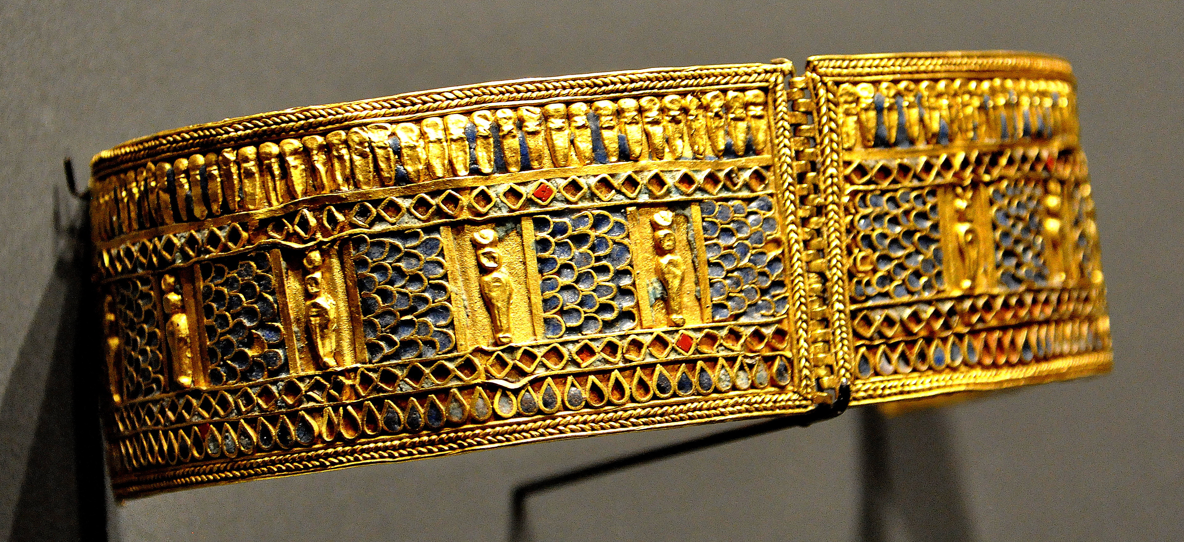 Gold armlet with depictions of mummiform gods. From the treasure of the Nubian queen Amanishakheto, pyramid N6, Meroe, modern-day northern Sudan. Meroitic period, around 1 CE. (State Museum of Egyptian Art, Munich, Germany).