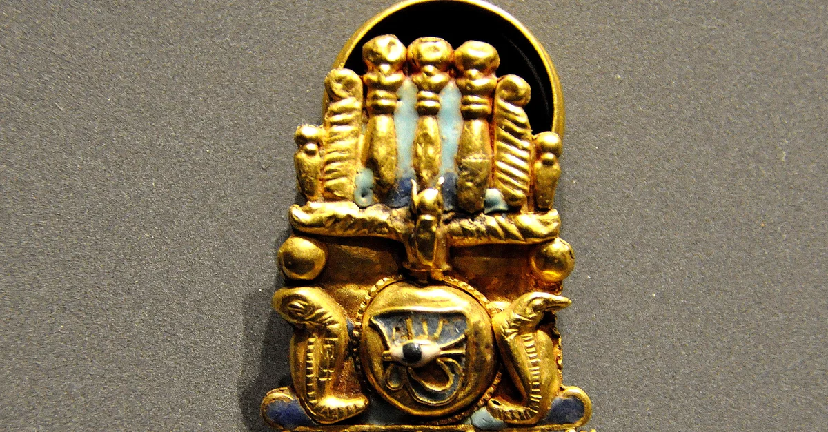 Golden shield ring an Udjat (Eye of Horus) in sun disc. From the treasure of the Nubian queen Amanishakheto, pyramid N6, Meroe, modern-day northern Sudan. Meroitic period, around 1 CE. (State Museum of Egyptian Art, Munich, Germany).