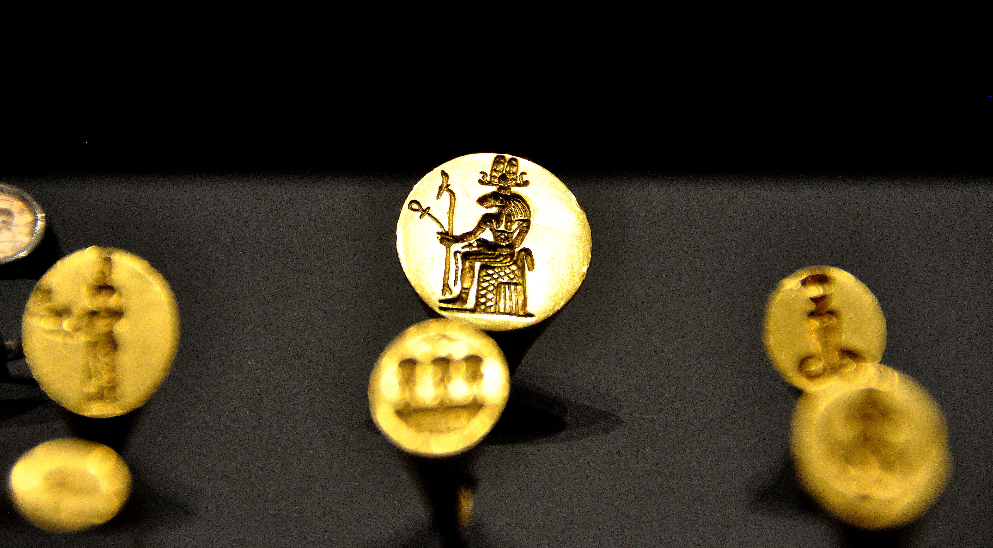 Several golden seal rings with different gods; the focus is on one ring only. From the treasure of the Nubian queen Amanishakheto, pyramid N6, Meroe, modern-day northern Sudan. Meroitic period, around 1 CE. (State Museum of Egyptian Art, Munich, Germany).