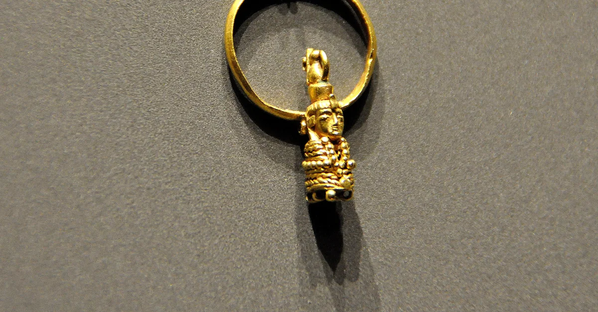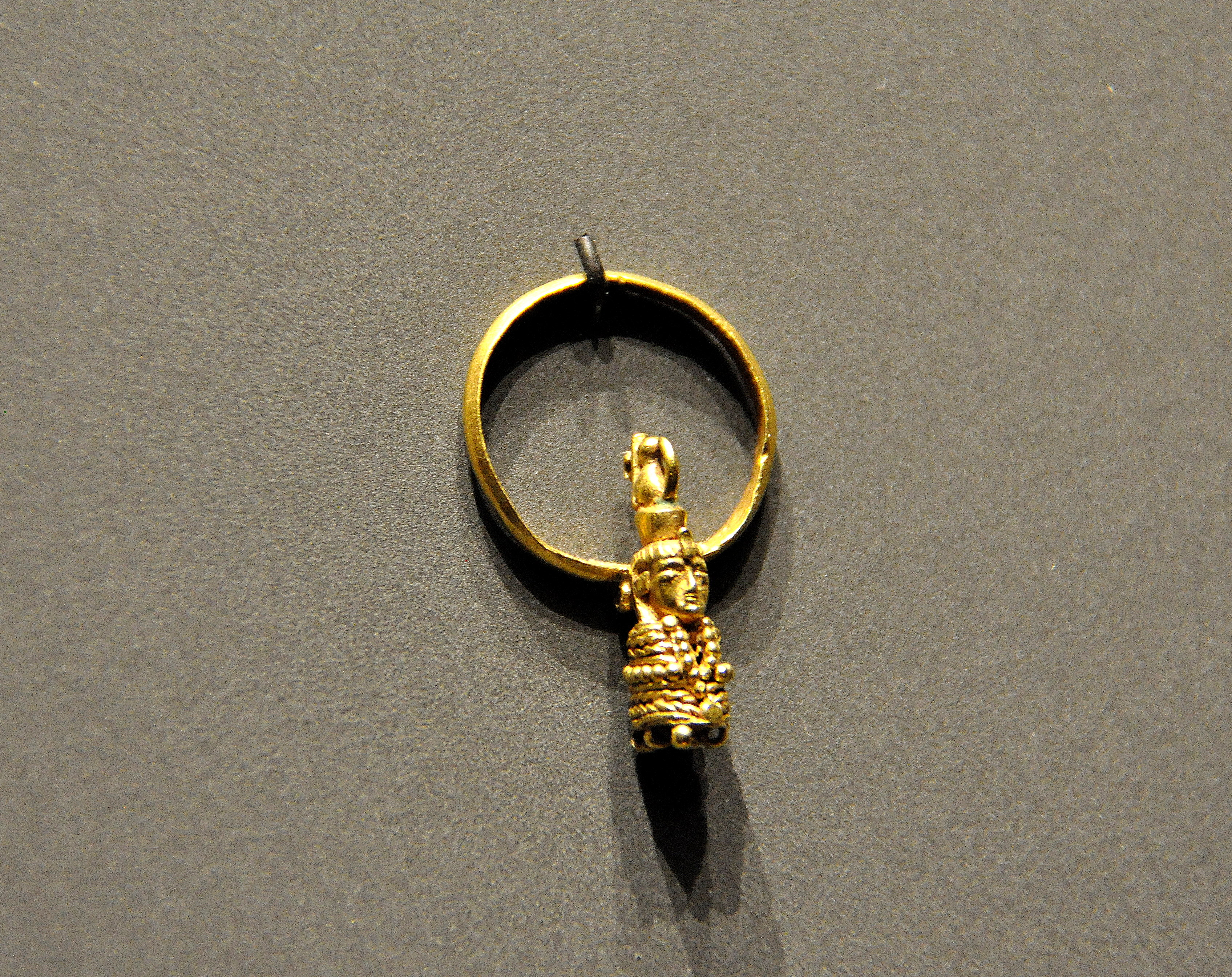 Golden shield ring with a bust of the goddess Mut. From the treasure of the Nubian queen Amanishakheto, pyramid N6, Meroe, modern-day northern Sudan. Meroitic period, around 1 CE. (State Museum of Egyptian Art, Munich, Germany).