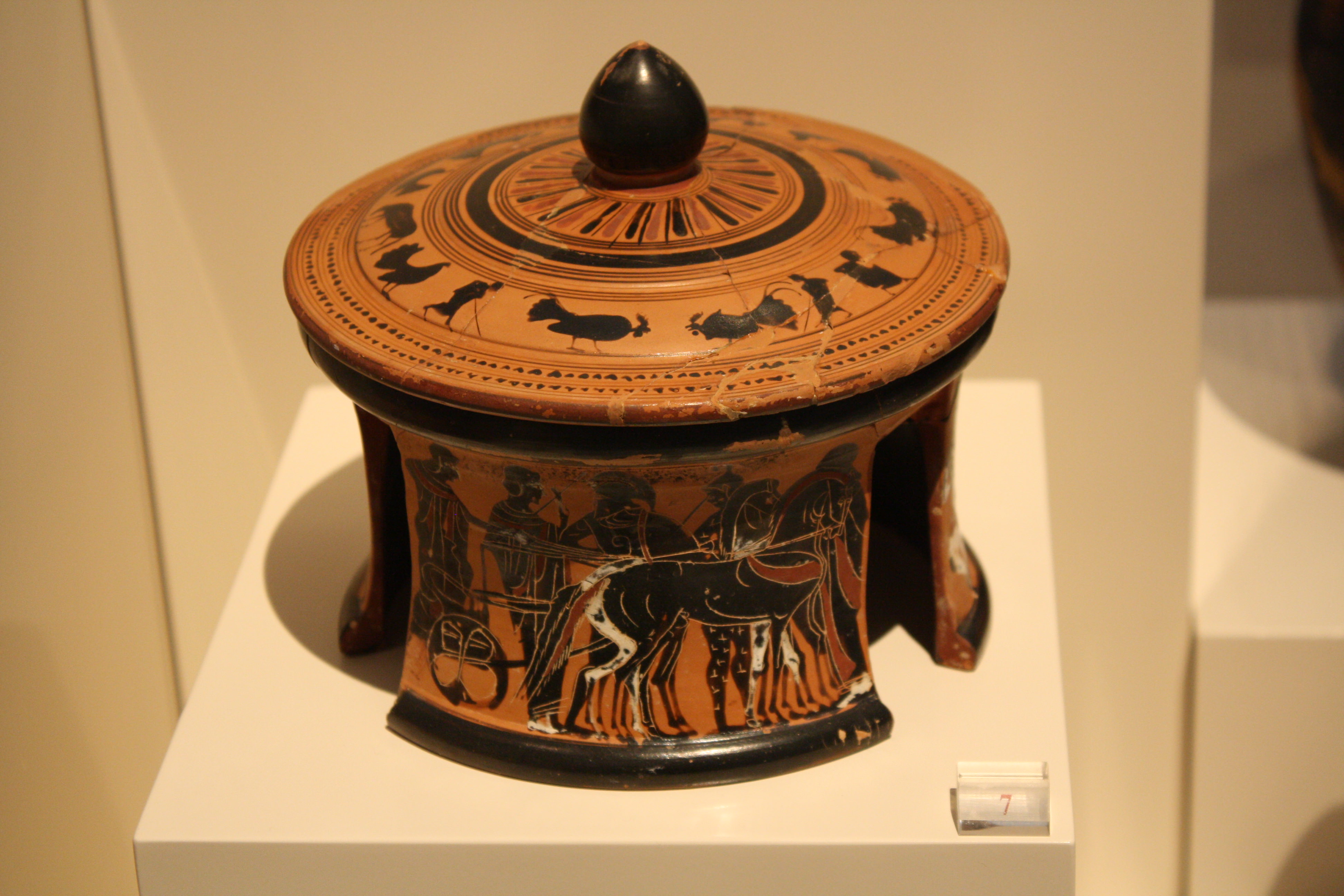 A black-figure tripod pyxis (lidded box) with scenes of an amazonomachy, Dionysos and Meaneads, and a woman driving a chariot. From the Kerameikos Athens, c 500 BCE. (National Archaeological Museum, Athens)