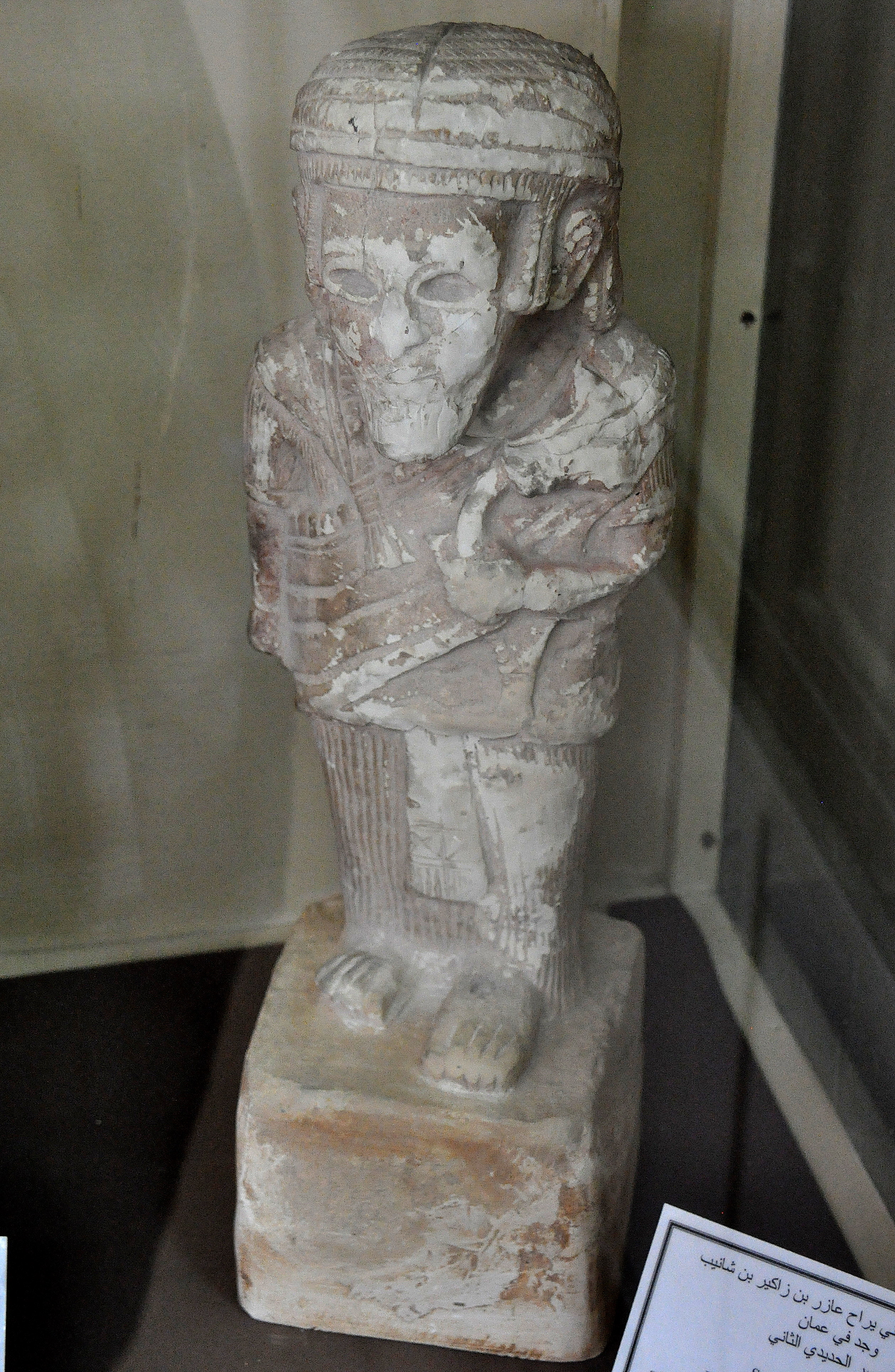 The inscriptions of this limestone statue mention that the statue belongs to Yerah'Azar, son of Zakir, son of Sanipu. Sanipu is known to have submitted to the Assyrian king Tiglath-Pileser III in the year 733 BCE. The eyes were originally inlaid. The left hand holds a lotus flower (sign of royalty). Traces of red paint can be seen. From modern-day Amman, Jordan. 8th century BCE. Jordan Archeological Museum, Amman, Jordan.