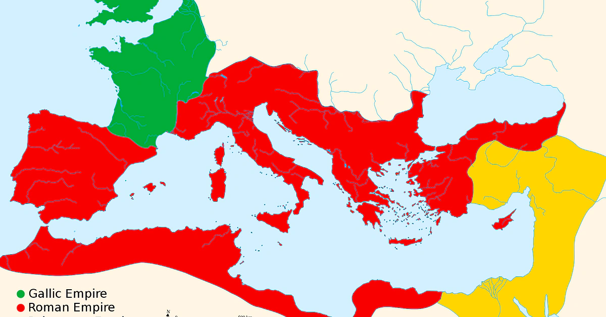 The Roman Empire by 271 CE before the reconquests of the Palmyrene Empire and Gallic Empire by Aurelian.