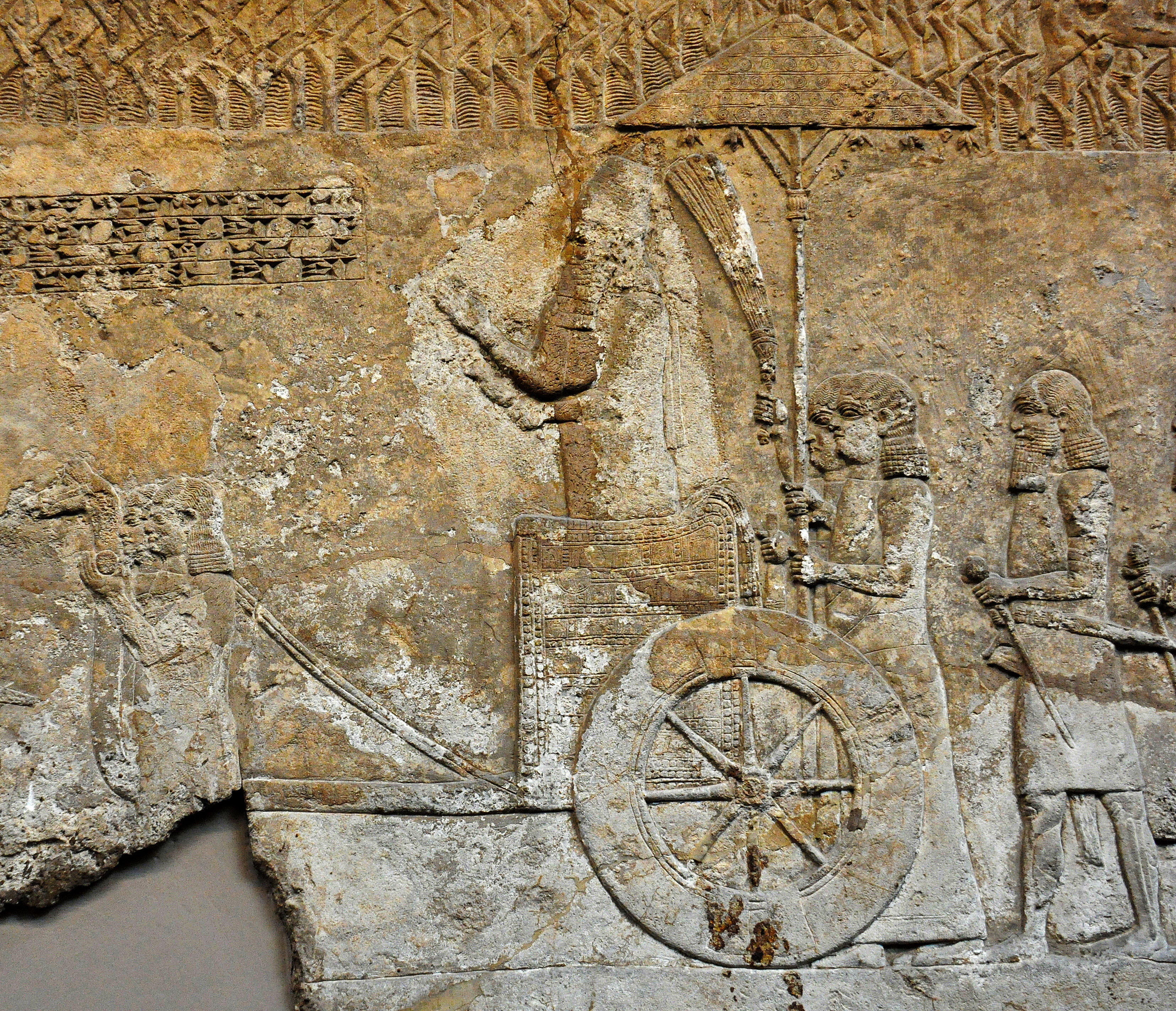 This bas-relief is part of a series of reliefs which depict the formation and transport of a colossal winged-bull (Lamassu) for the palace of the Assyrian king Sennacherib. In this relief, the king stands in a rickshaw (a royal chariot which pulled by two servants) and he watches the progress of the work. A servant fans the king and another one holds a sunshade over the king's head. From court VI, probably panel 60 of the South-West palace at Nineveh (modern Mosul Governorate, Iraq), northern Mesopotamia. Neo-Assyrian period, 700-692 BCE. (The British Museum, London).