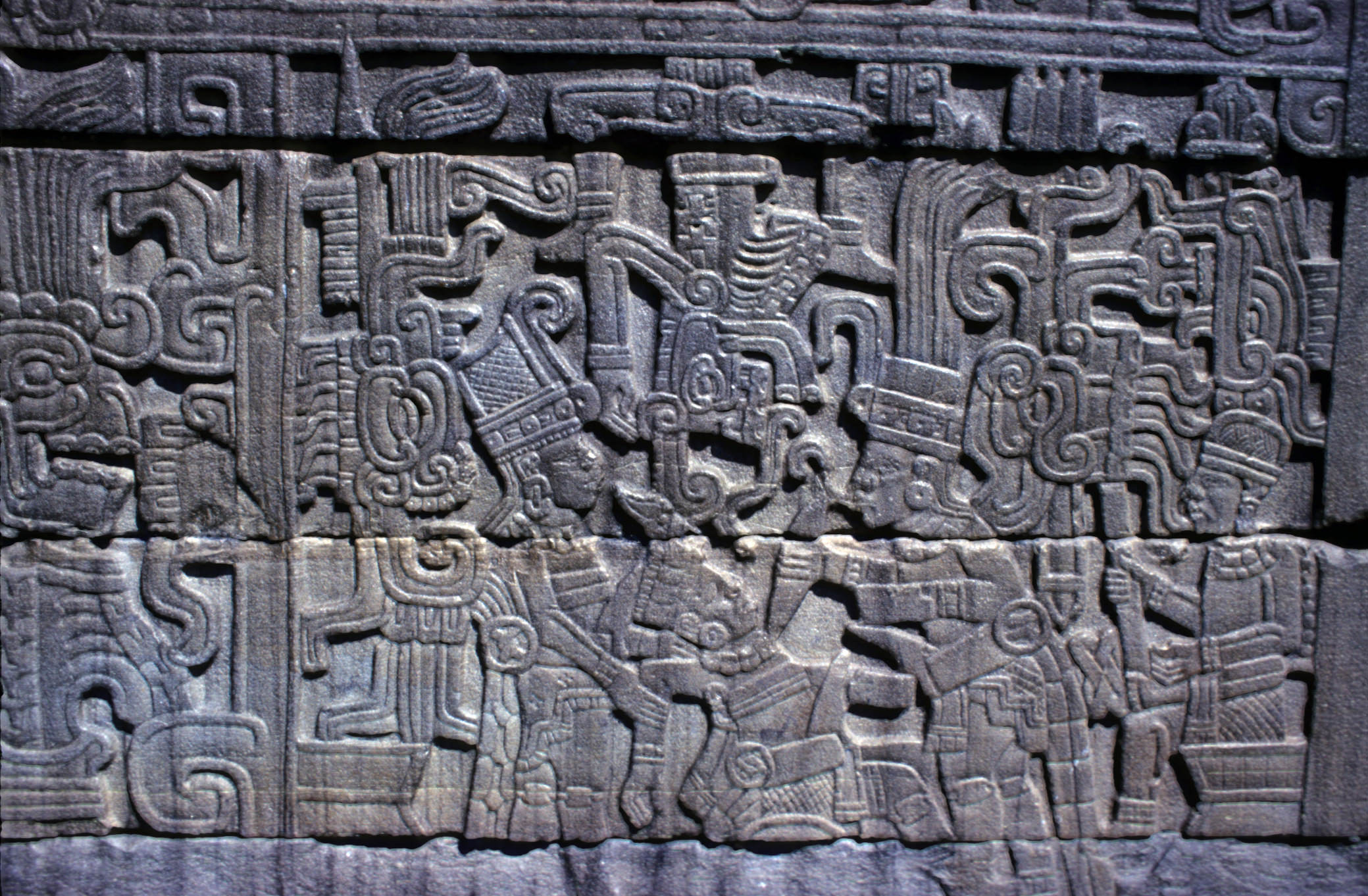 A relief panel from the south ballcourt of El Tajin, Veracruz showing two players holding down and extracting the heart of a third player. A skeletal figure rises from a pot on the left side. 700-900 CE.