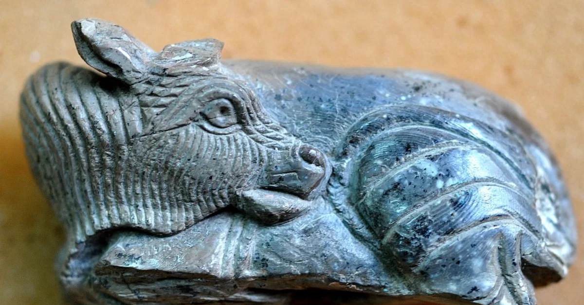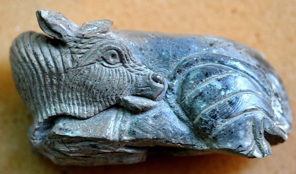 An exquisitely carved plaque of a supine bull. Note the black burn mark. Probably, this was part of a group which once supported an ivory tray. Neo-Assyrian period, 9th-7th centuries BCE. From Nimrud, Mesopotamia, Iraq. (The Sulaimaniya Museum, Iraq).