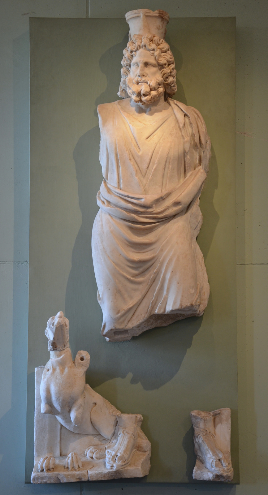 The Egyptian deity Serapis, with a modius on the head, is depicted as Pluto. Next to him stands the three-headed dog Cerberus, guardian of Hades and the Greek underworld. From the Roman Villa of Chiragan, France. (Musée des Antiques de Toulouse)