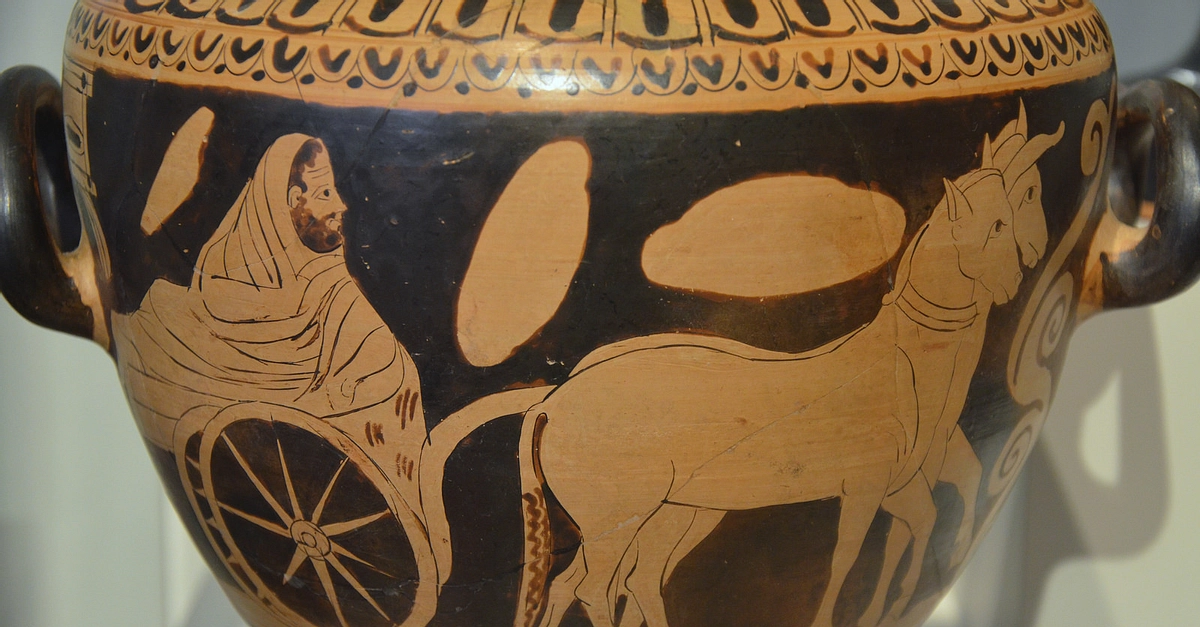 Etruscan red-figured stamnos with depiction of a journey to the Underworld. The deceased lies on a cart pulled by mules. From Bomarzo (Italy). Around 300 BCE. (Altes Museum, Berlin)