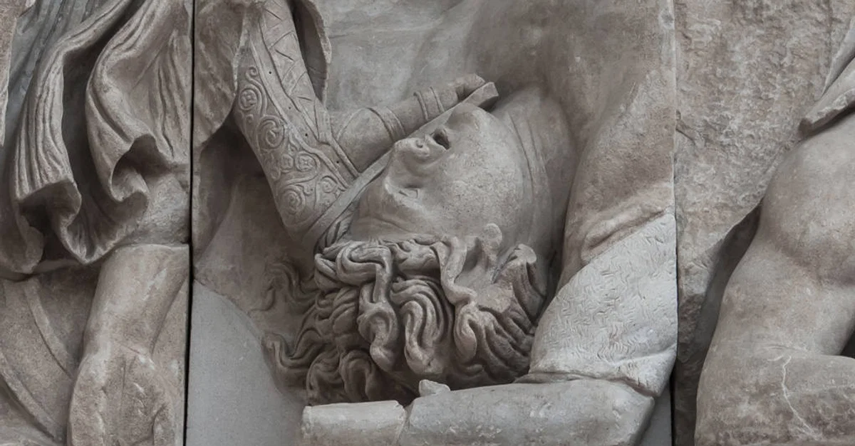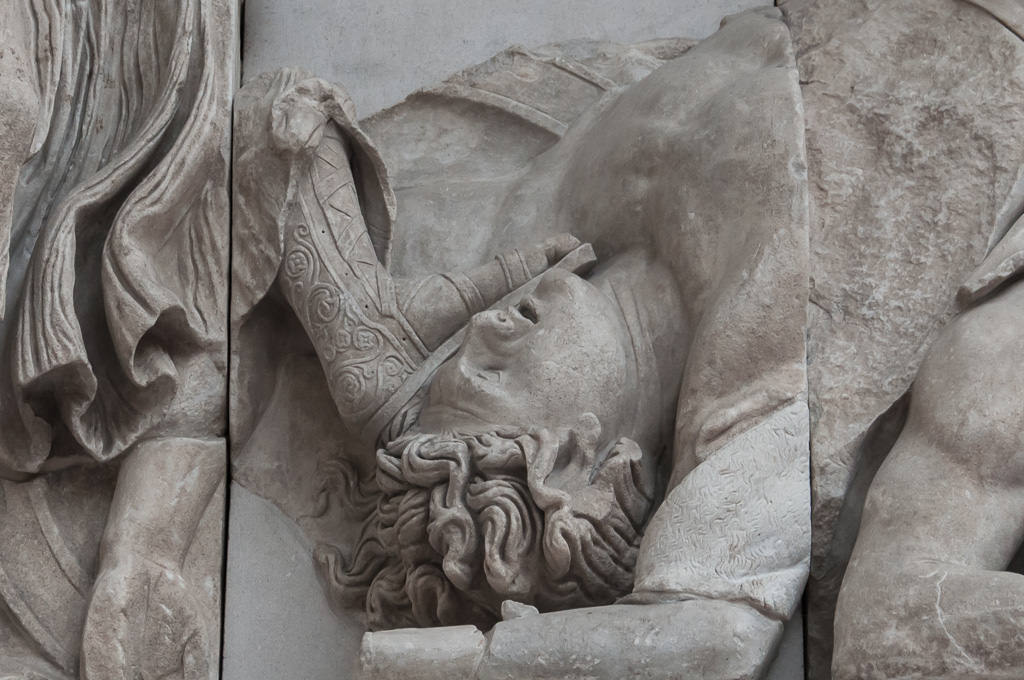 Detail from the Pergamon Altar's north frieze (The frieze depicts the Gigantomachy); Aphrodite killing the giant; built in 2nd century BCE; Today in the Pergamon Museum in Berlin.