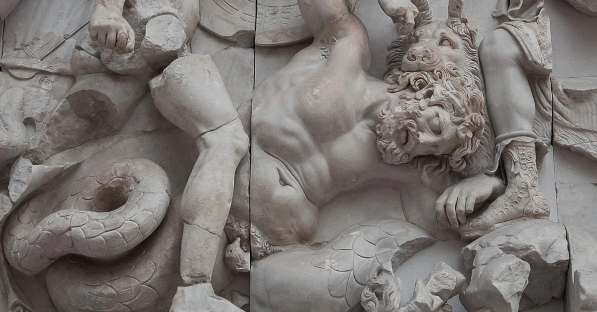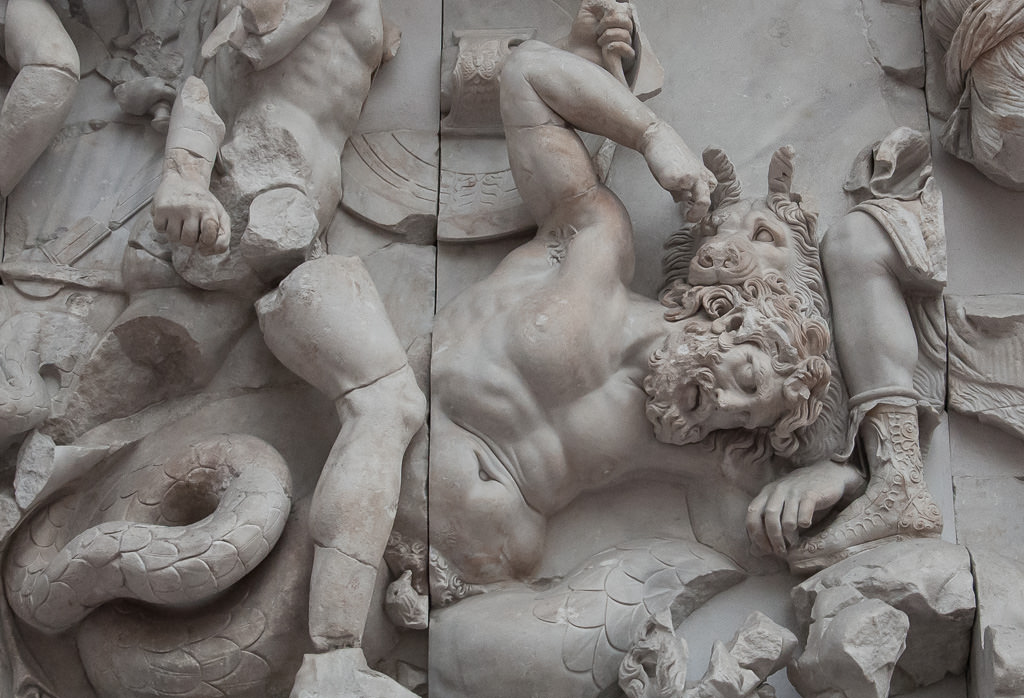 The giant is killed by Artemis' dog (Artemis' leg on right); Detail from the Pergamon Altar's frieze (The frieze depicts the Gigantomachy); built in 2nd century BCE; Today in the Pergamon Museum in Berlin.