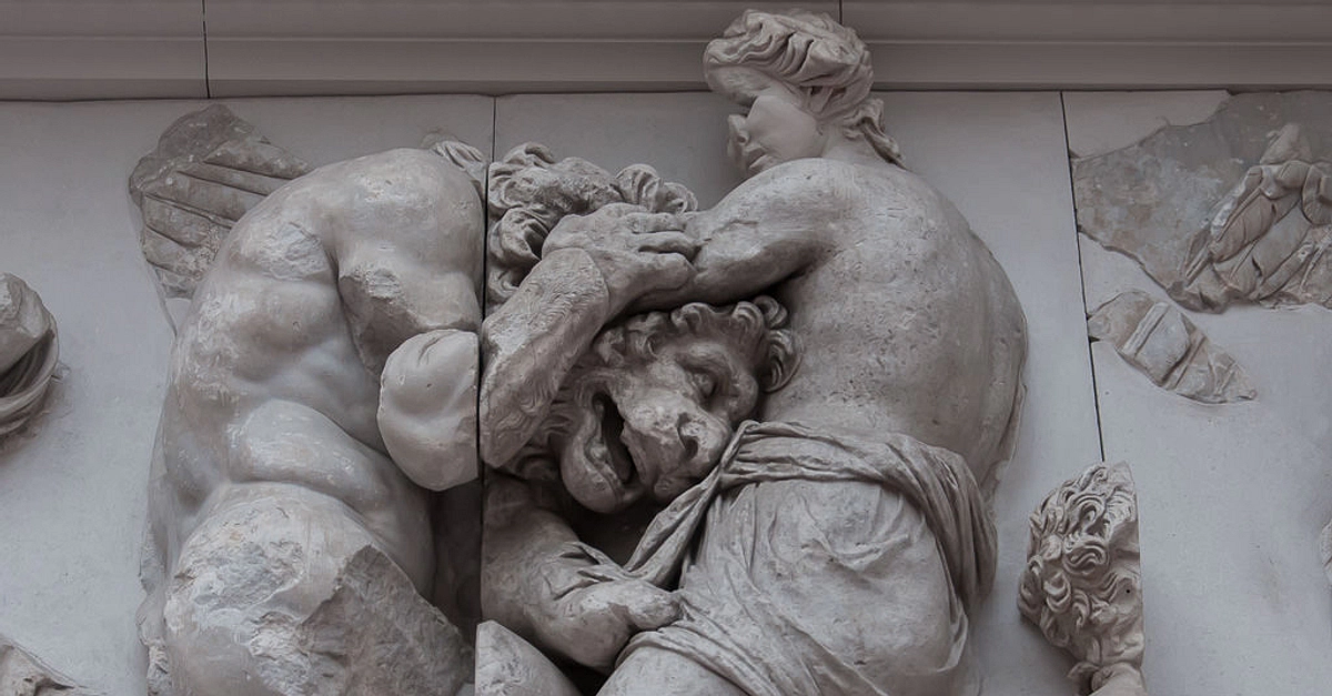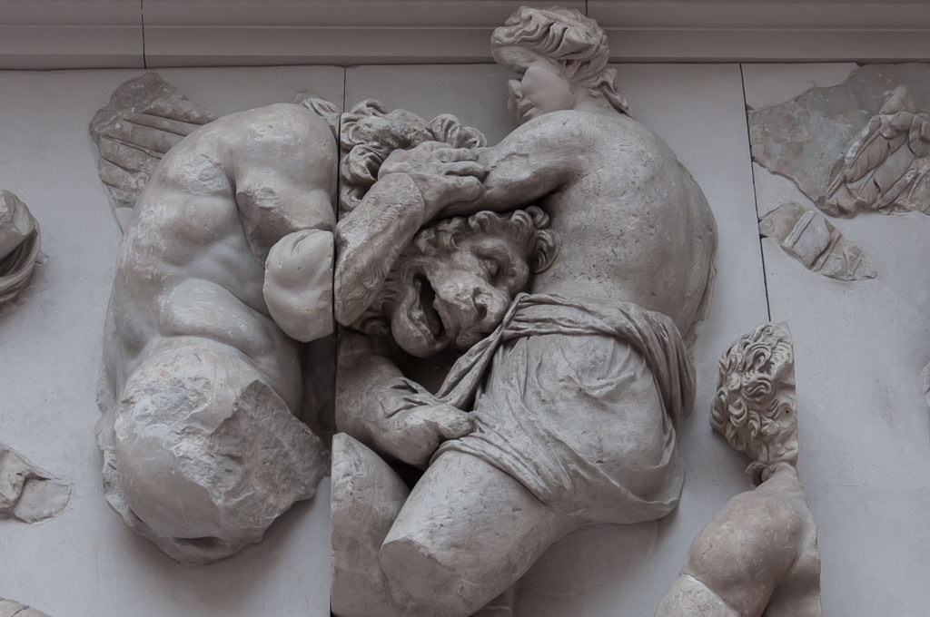 The god depicted here is not identified, he is fighting a Giant who has a lion's head, snake legs and a human body. Detail from the Pergamon Altar's frieze (The frieze depictsa Gigantomachy); built in 2nd century BCE. (Pergamon Museum, Berlin)