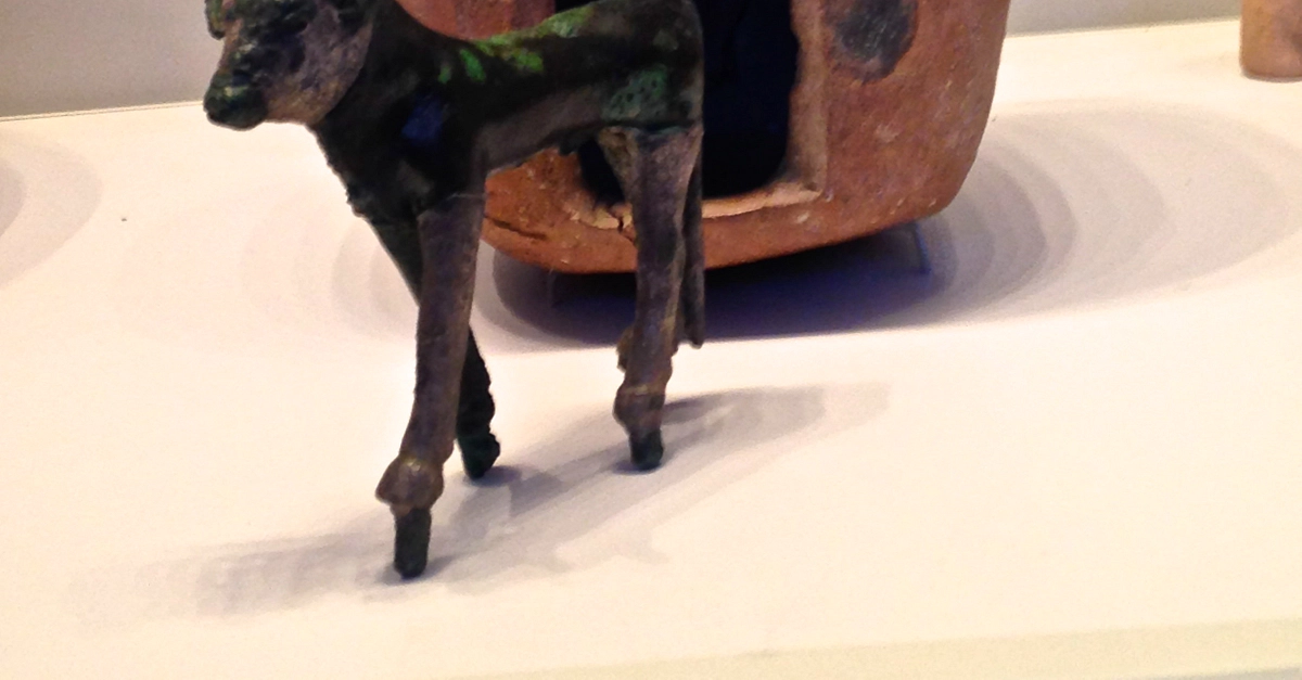 From Ashkelon, 16th century BCE, pottery and silver-plated bronze. The statuette of a calf was found inside the small model shrine, discovered in a temple in Ashkelon. The horned calf is meant to symbolize the young and energetic storm god. Located and photographed in the Israel Museum, Jerusalem.