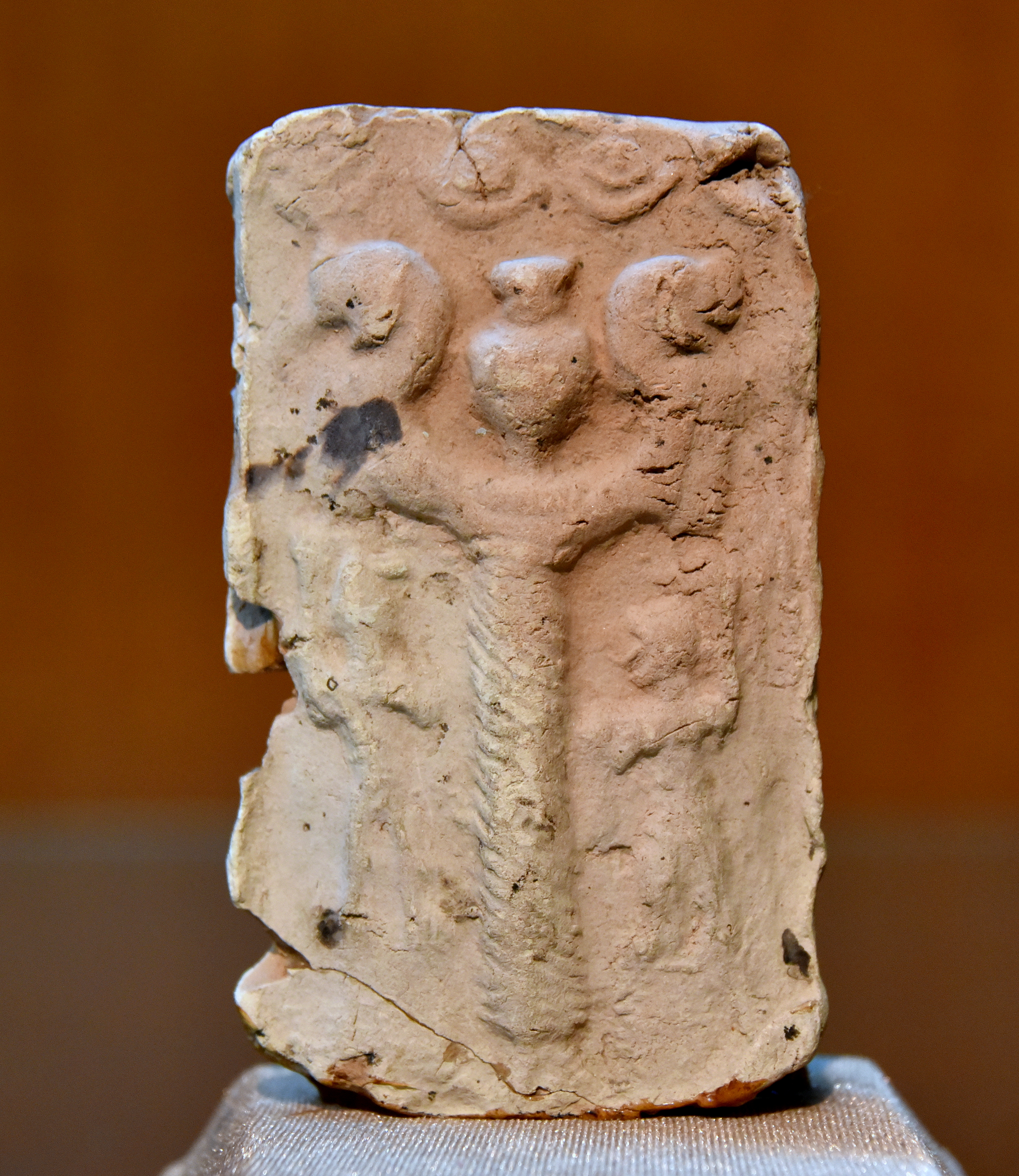 Old-Babylonian fired clay plaque depicting Ningishzida, the Mesopotamian deity of vegetation and the underworld, flanked by 2 small human figures. Found during the 2nd excavation season of the Oriental Institute of the University of Chicago at the Scribal Quarter of Nippur, Southern Mesopotamia, modern-day Iraq, dating to 2003-1595 BCE.