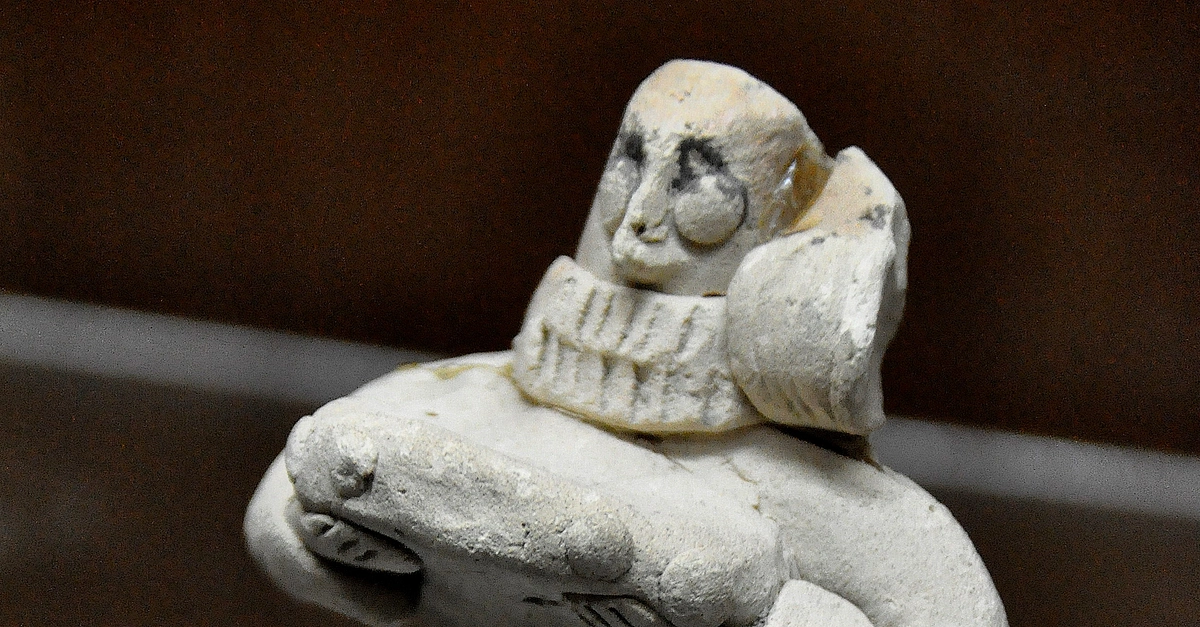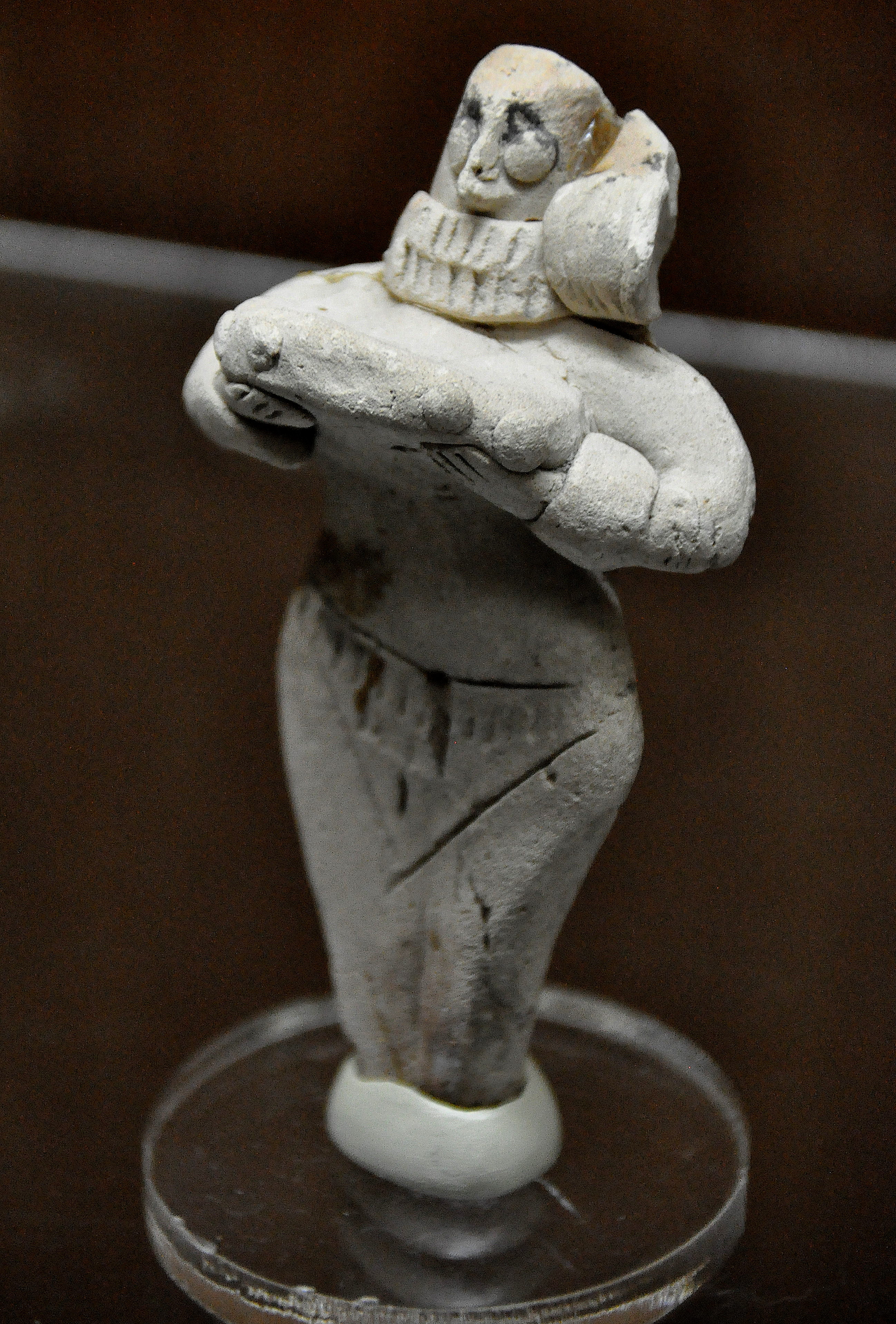 This terracotta statuette depicts a nude woman. She holds a daf (dap) in front of her bare chest. She wears a prominent collar and bracelets. The pubic area is highlighted. From Mesopotamia, modern-day Iraq. Early dynastic period, 2800-2300 BCE. The Sulaimaniya Museum, Iraq.