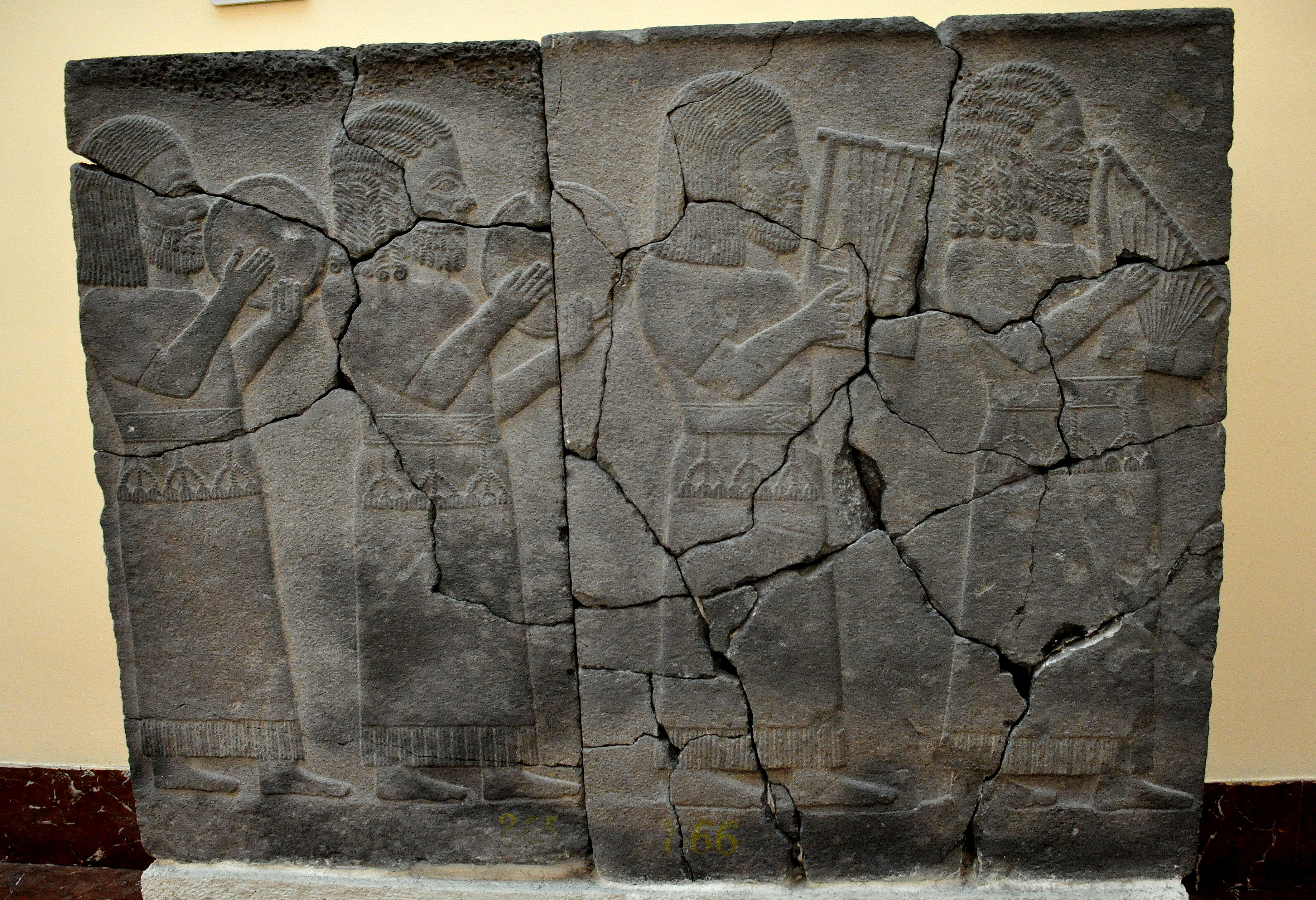 This basalt wall relief depicts four people playing on musical instruments. From Sam'al (modern-day Sinjerli, Gaziantep, Turkey). Late Hittite period, 8th century BCE. (Istanbul Archeological Museums/Ancient Orient Museum, Istanbul, Turkey).